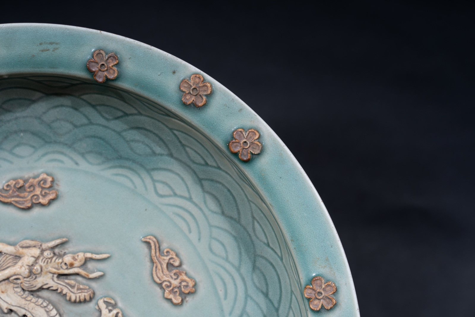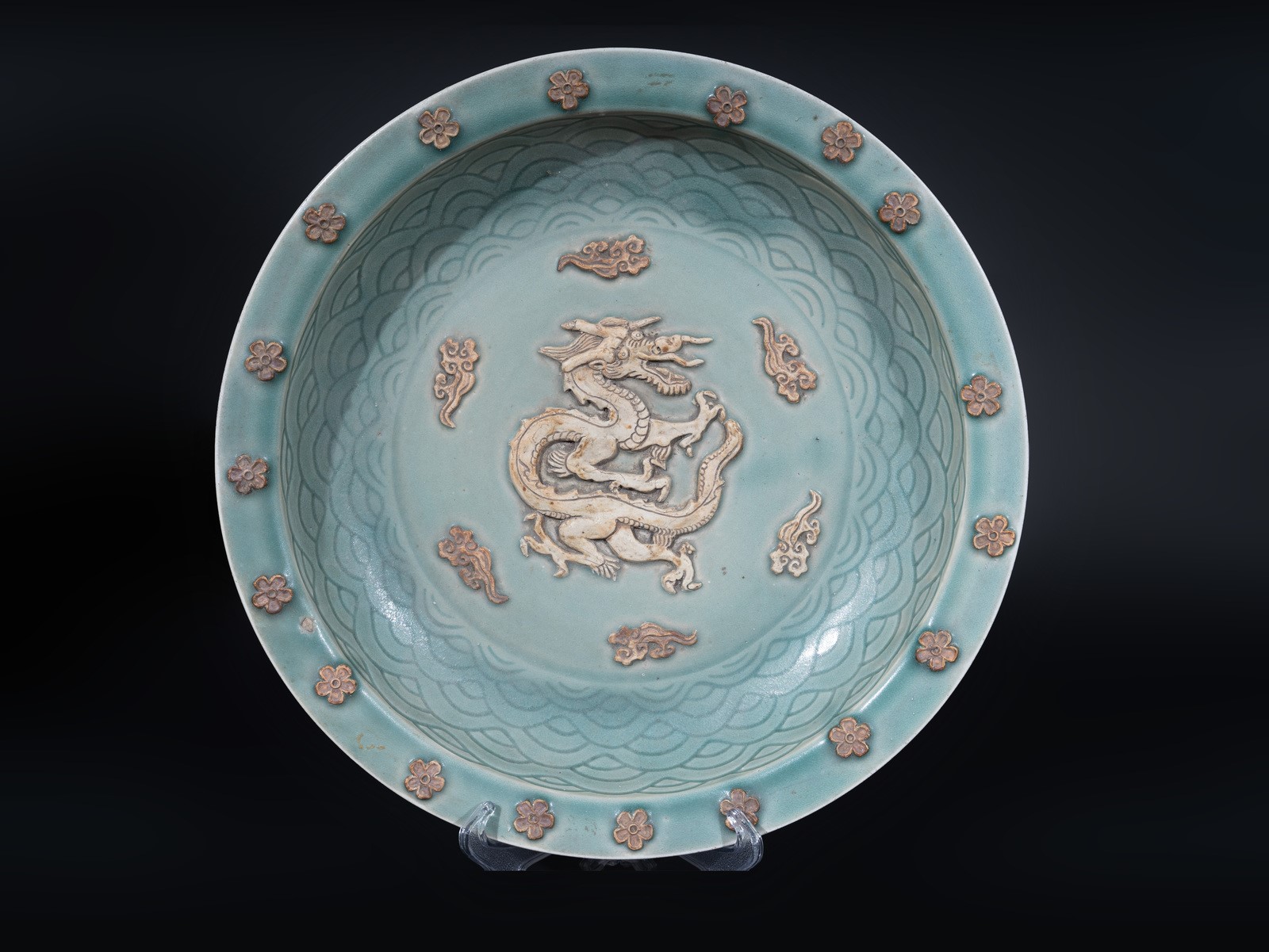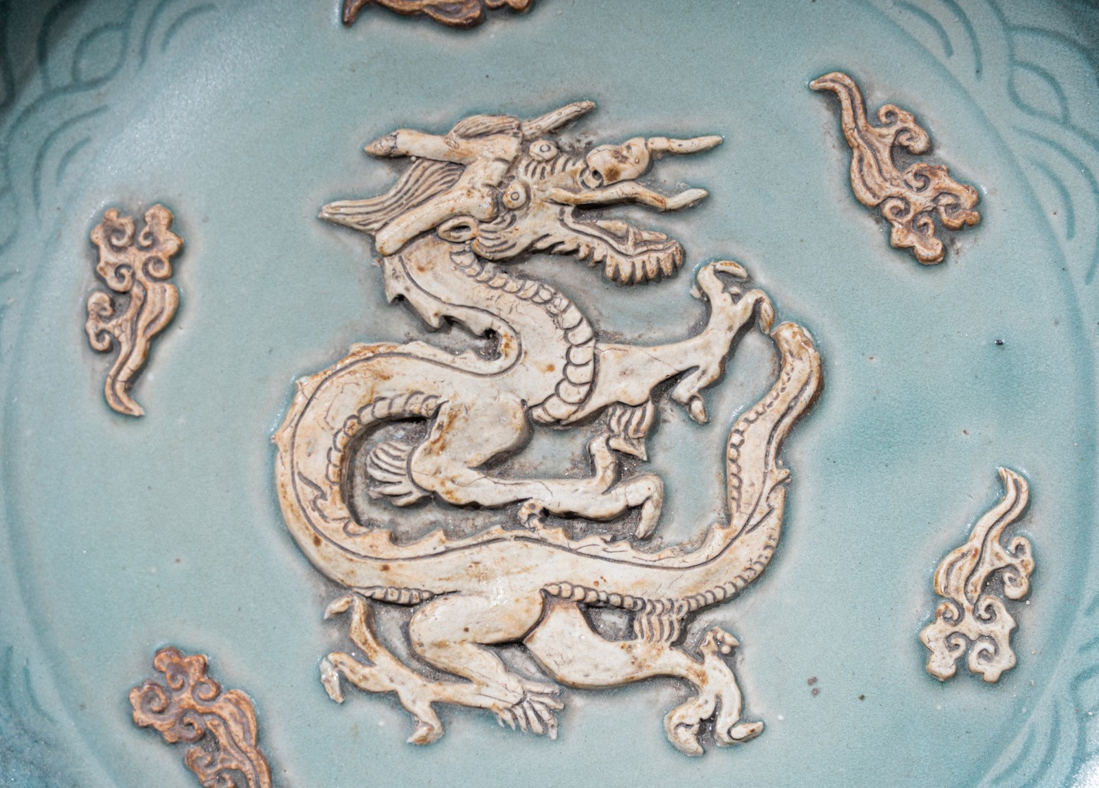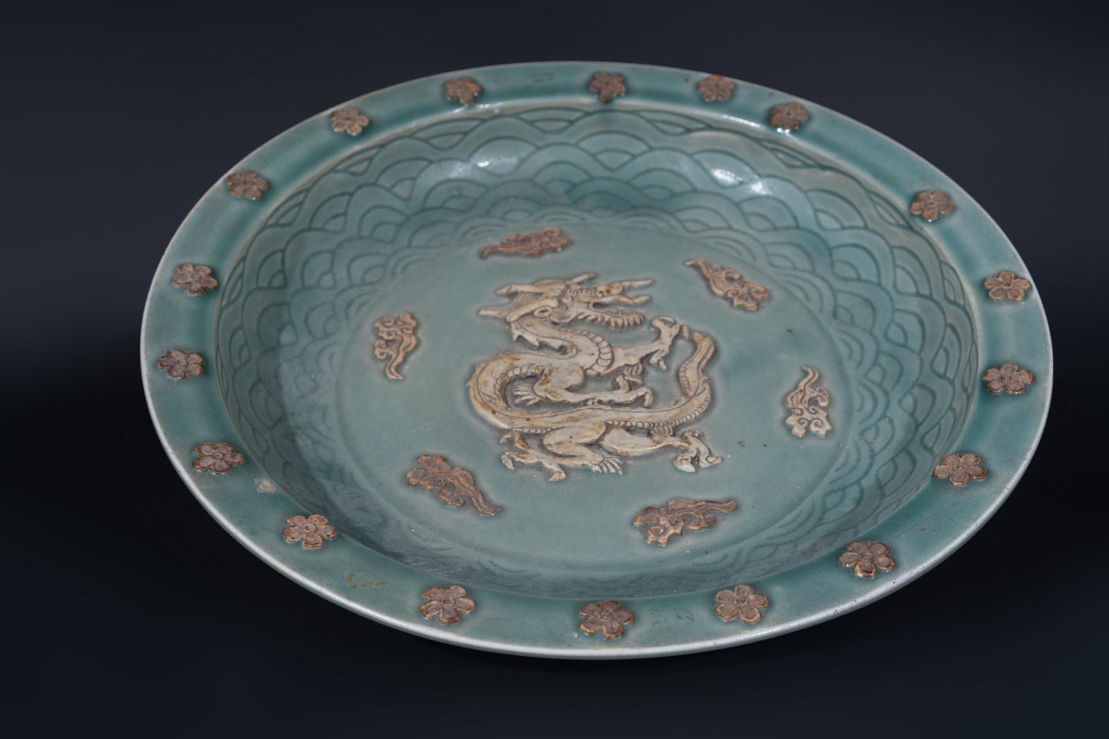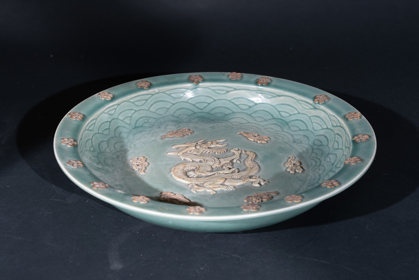 Arte Cinese A large celadon glazed tray with biscuit decoration China, early 20th century .