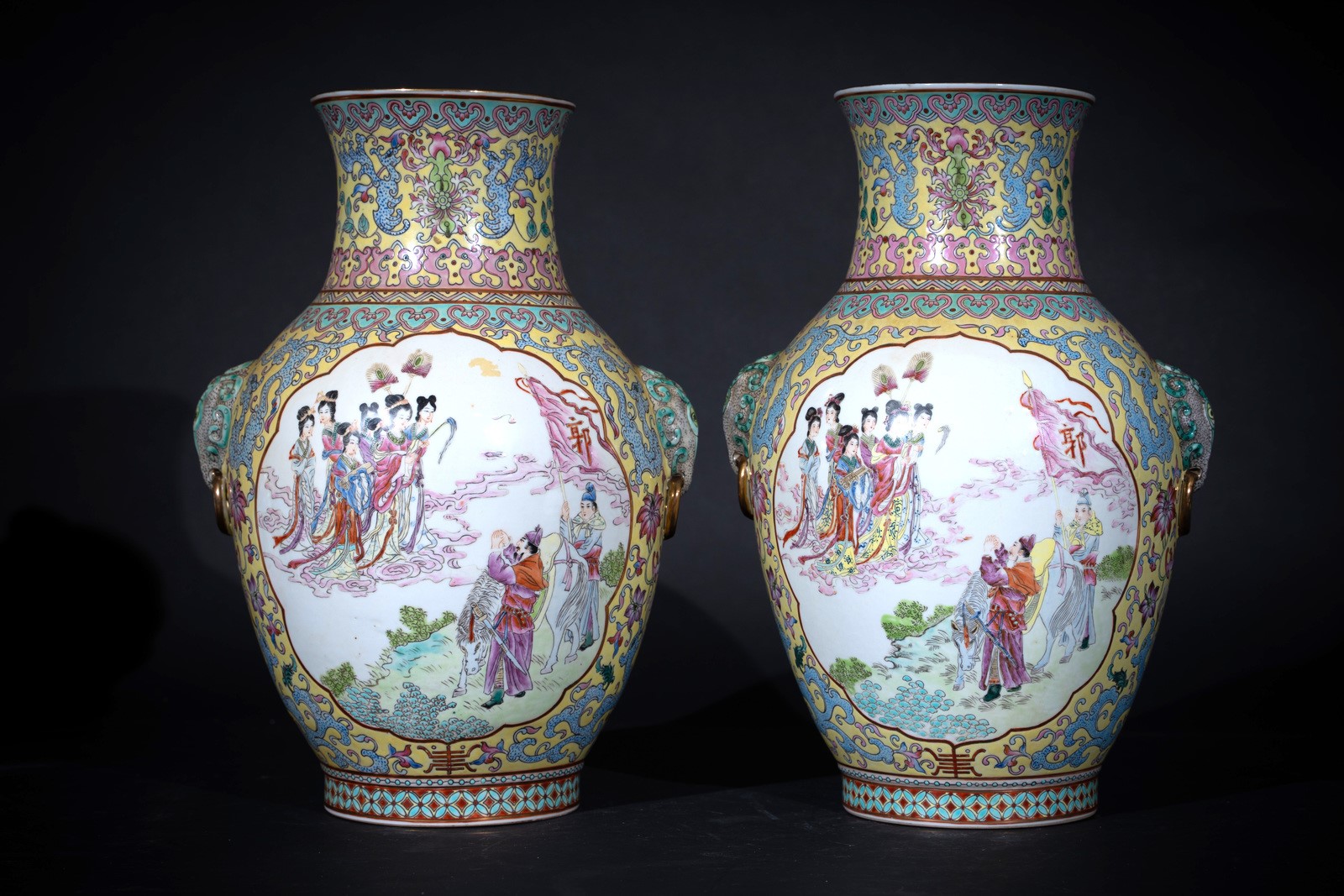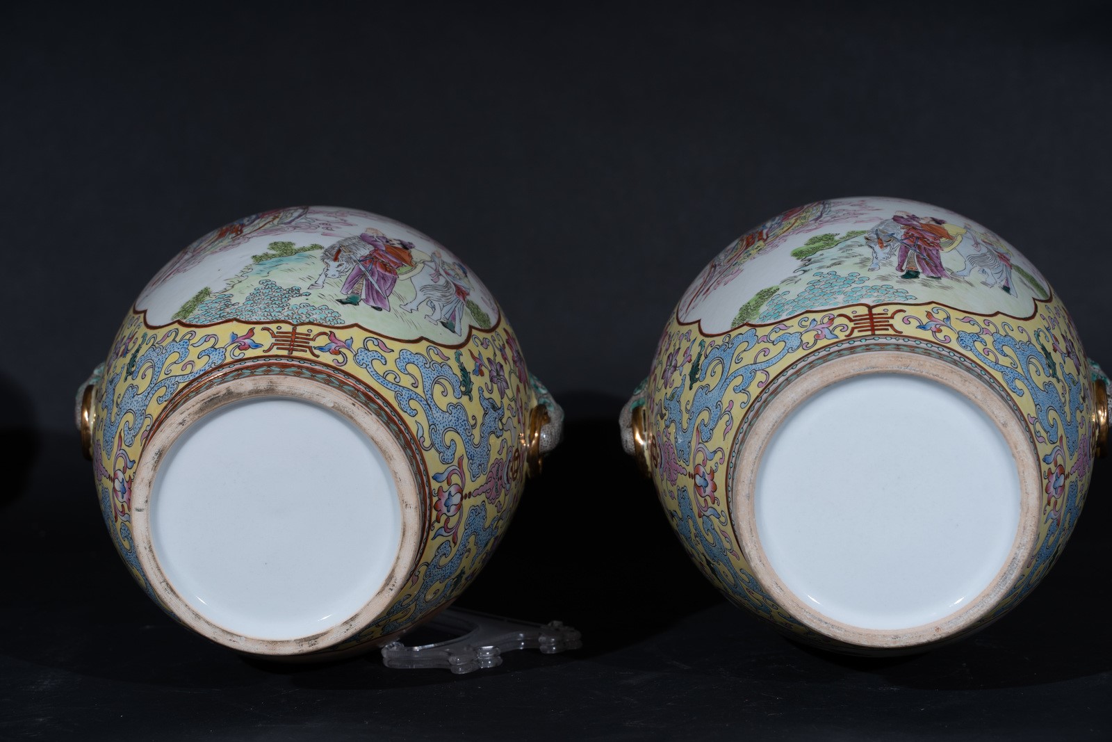 Arte Cinese A pair of porcelain vases over yellow ground China, 19th-20th century .