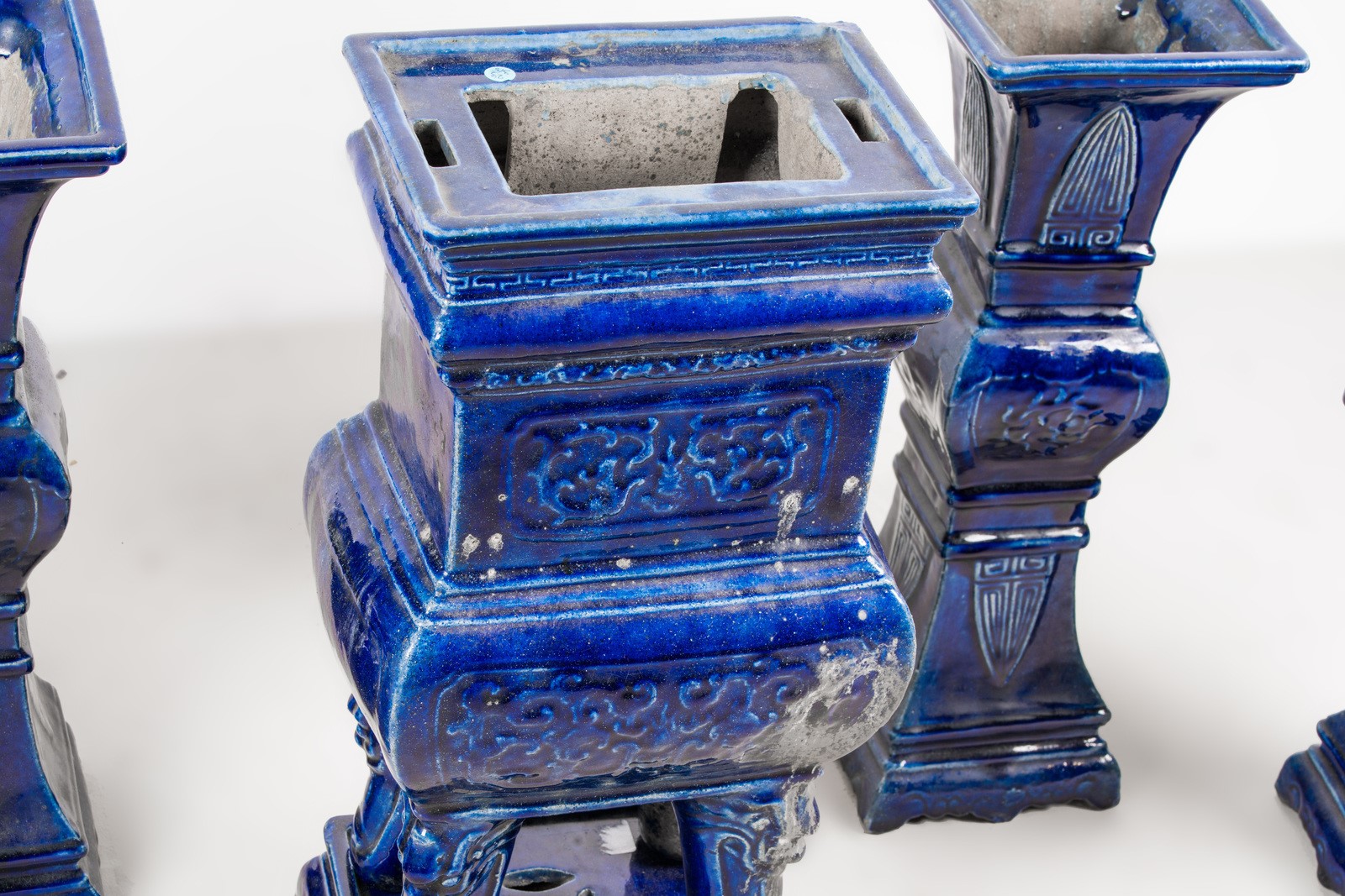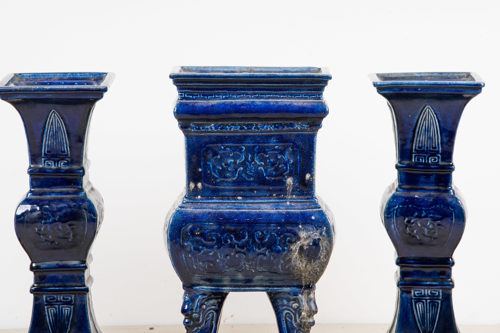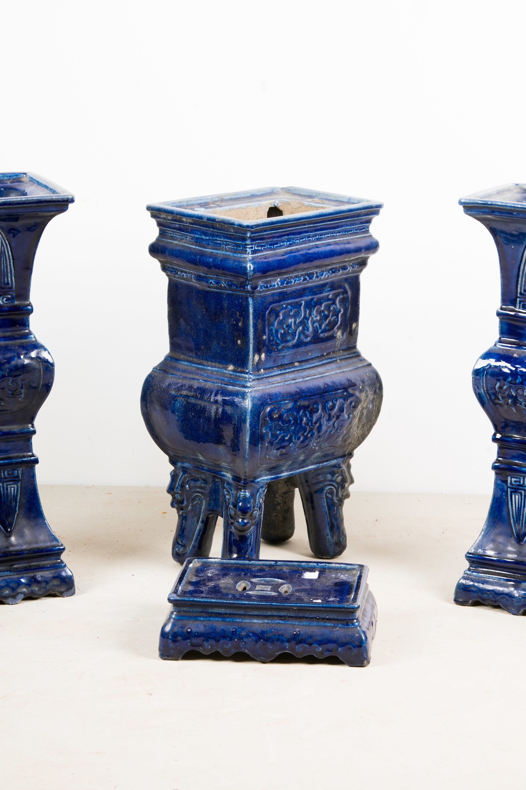 Chinese Art A blue glazed altar guarniture set composed of five porcelain pieces decorated with archaic motifs China, Ming dynasty, 16th century . . Cm 18,00 x 60,00.