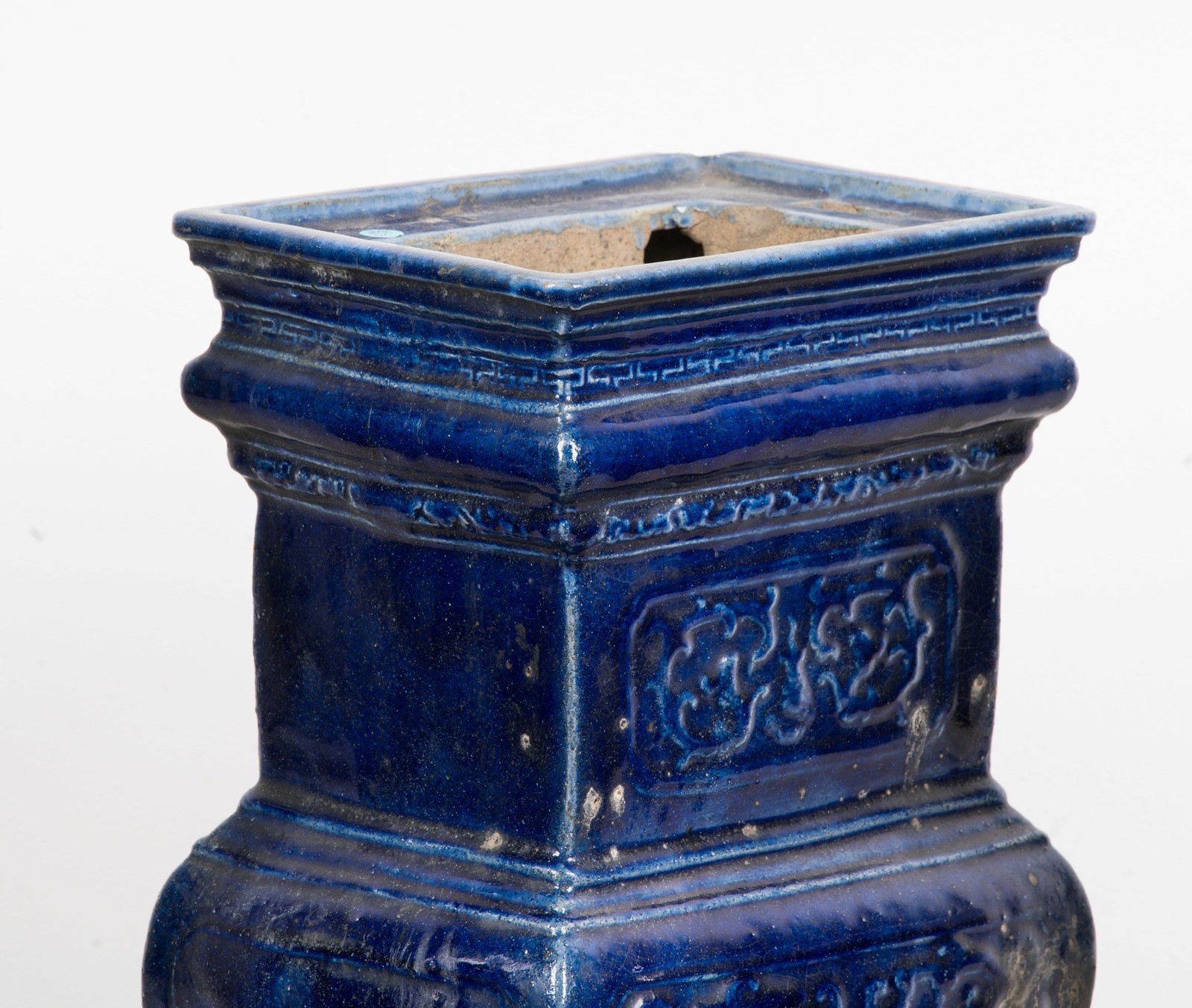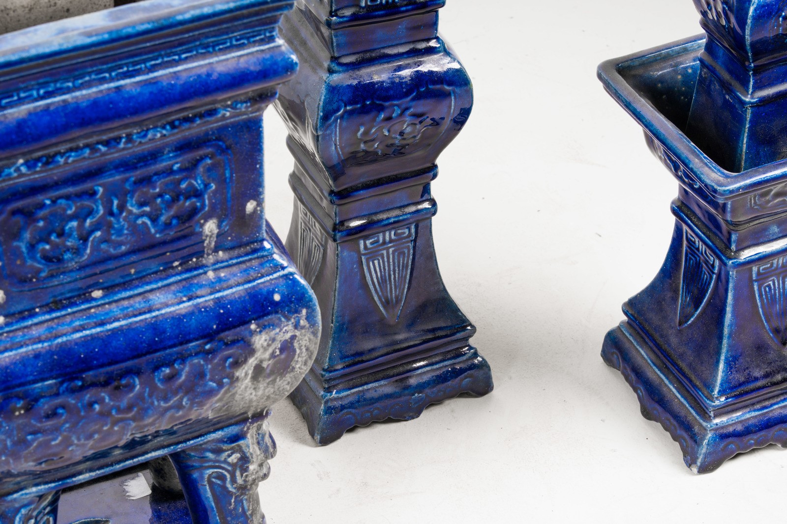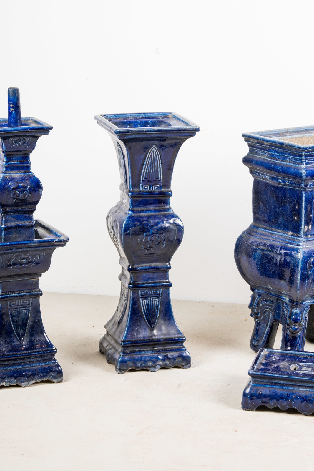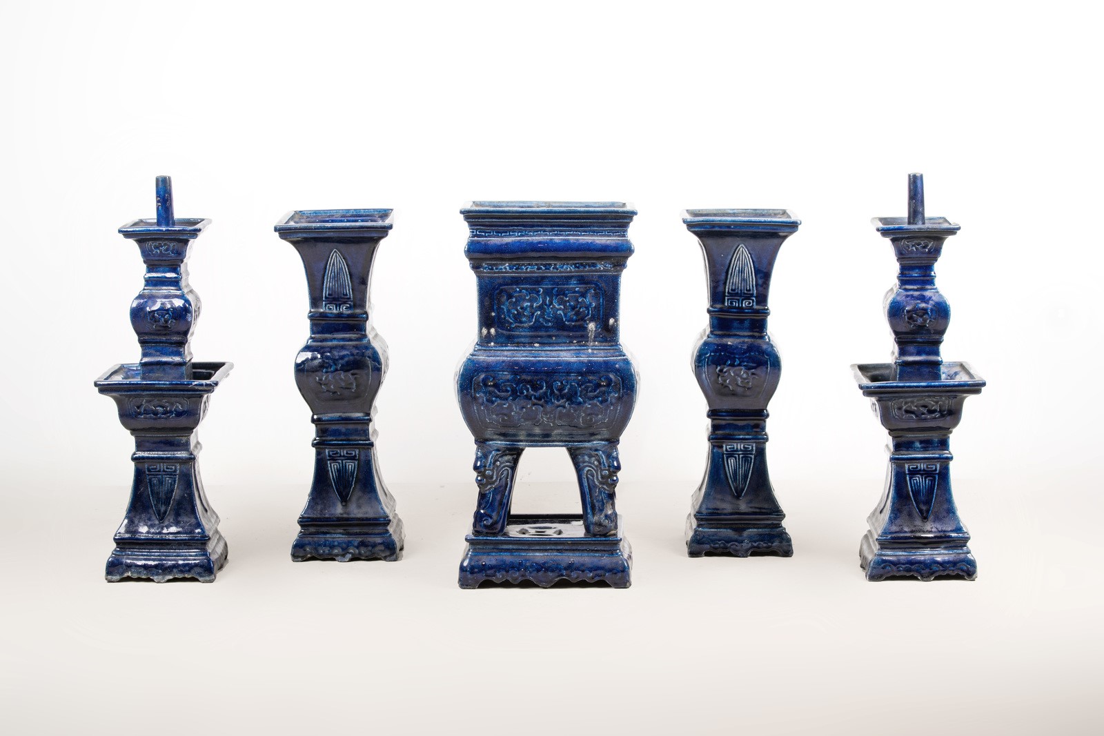 Arte Cinese A blue glazed altar guarniture set composed of five porcelain pieces decorated with archaic motifs China, Ming dynasty, 16th century .