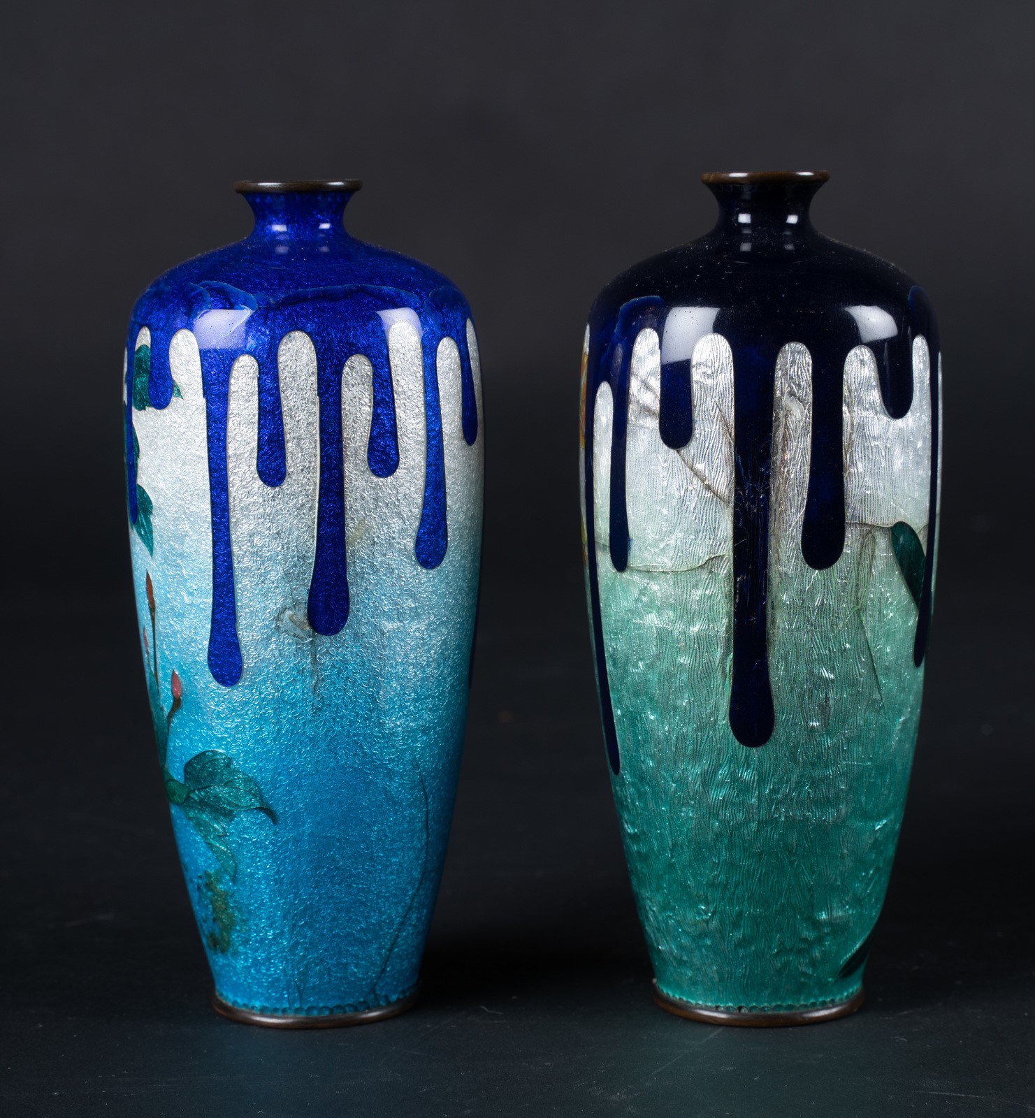 Arte Cinese A pair of guilloche vases with floral and dripping decoration Japan, early 20th century .