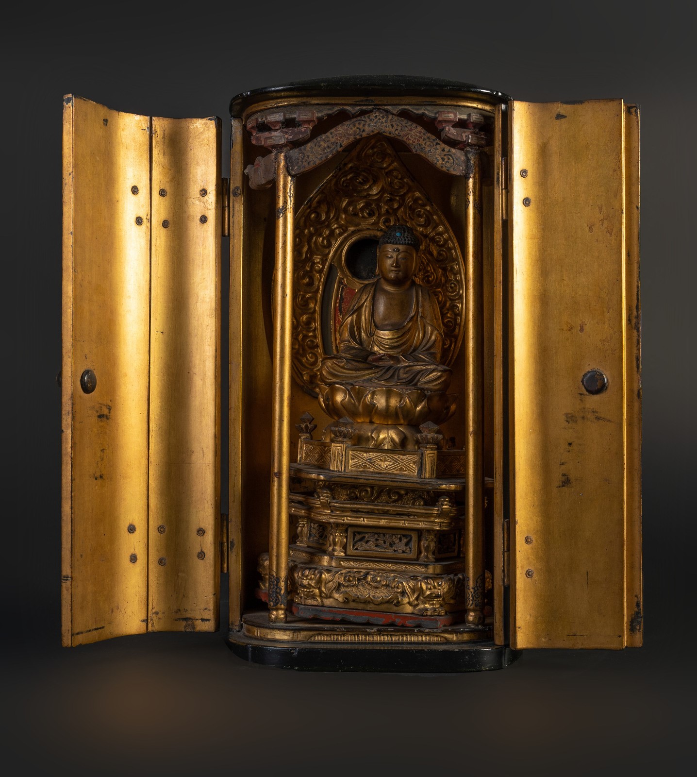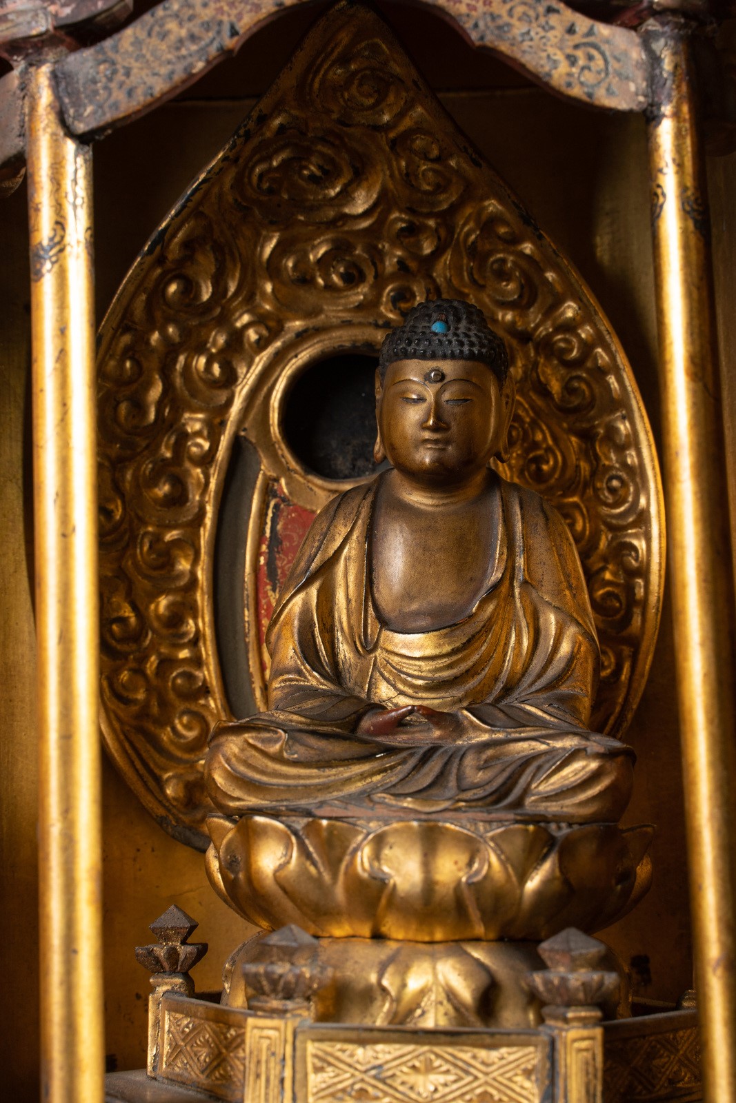Japanese Art A gilt lacquered wooden altar figure of Amitabha Japan, 19th century . . Cm 14,00 x 27,00.