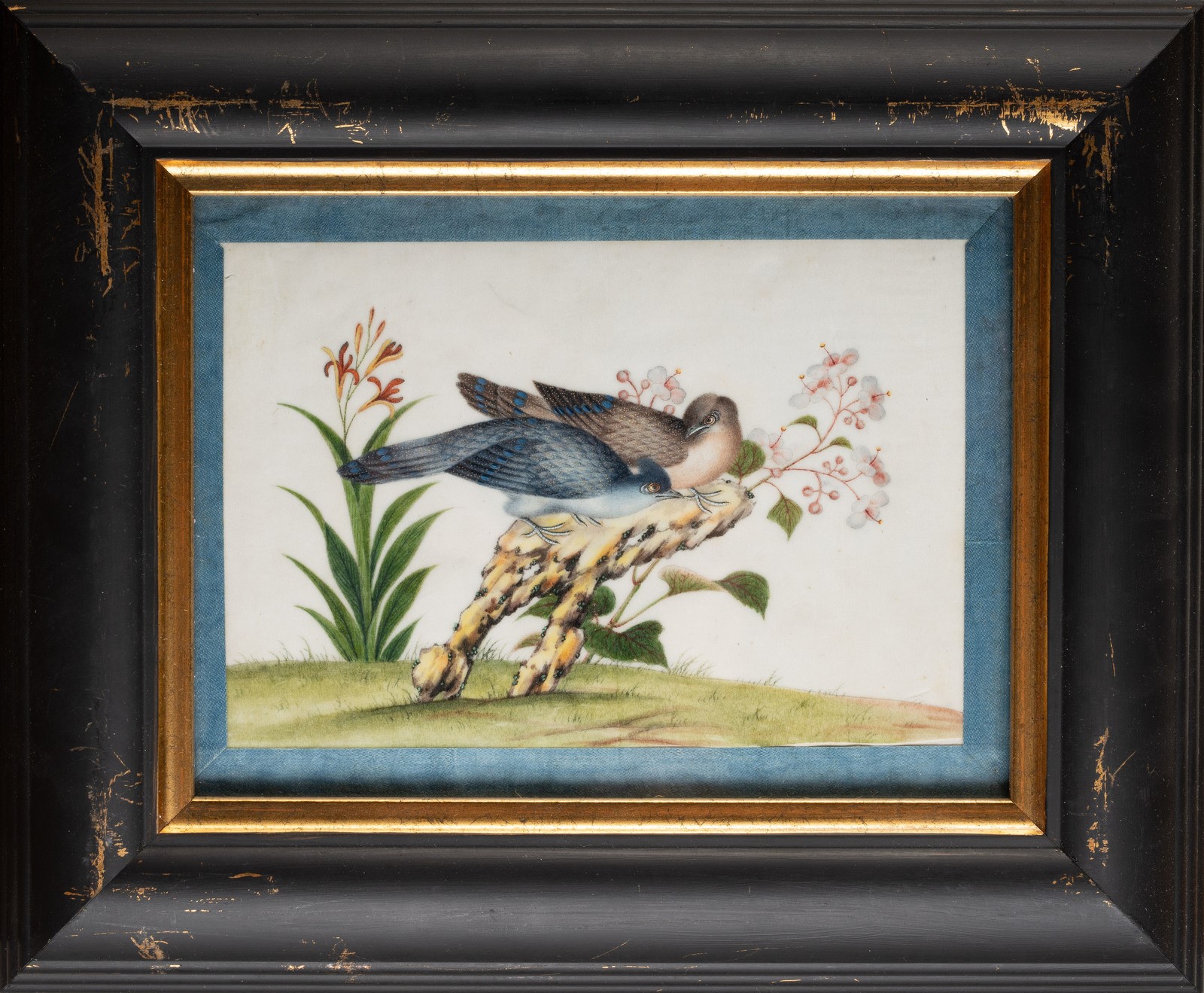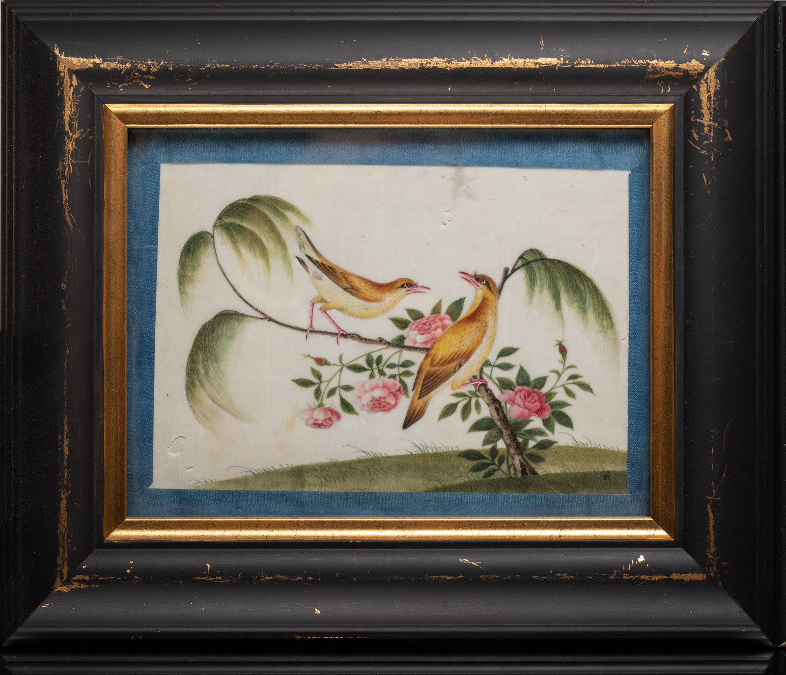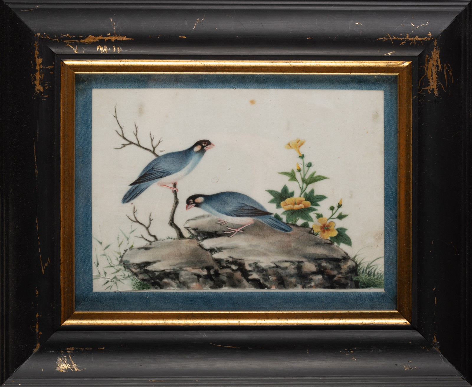 Chinese Art A set of six Canton paintings on pith paper depicting birds and flowers China, mid 19th century. . . depicting various birds among flowering shrubs. Frame present