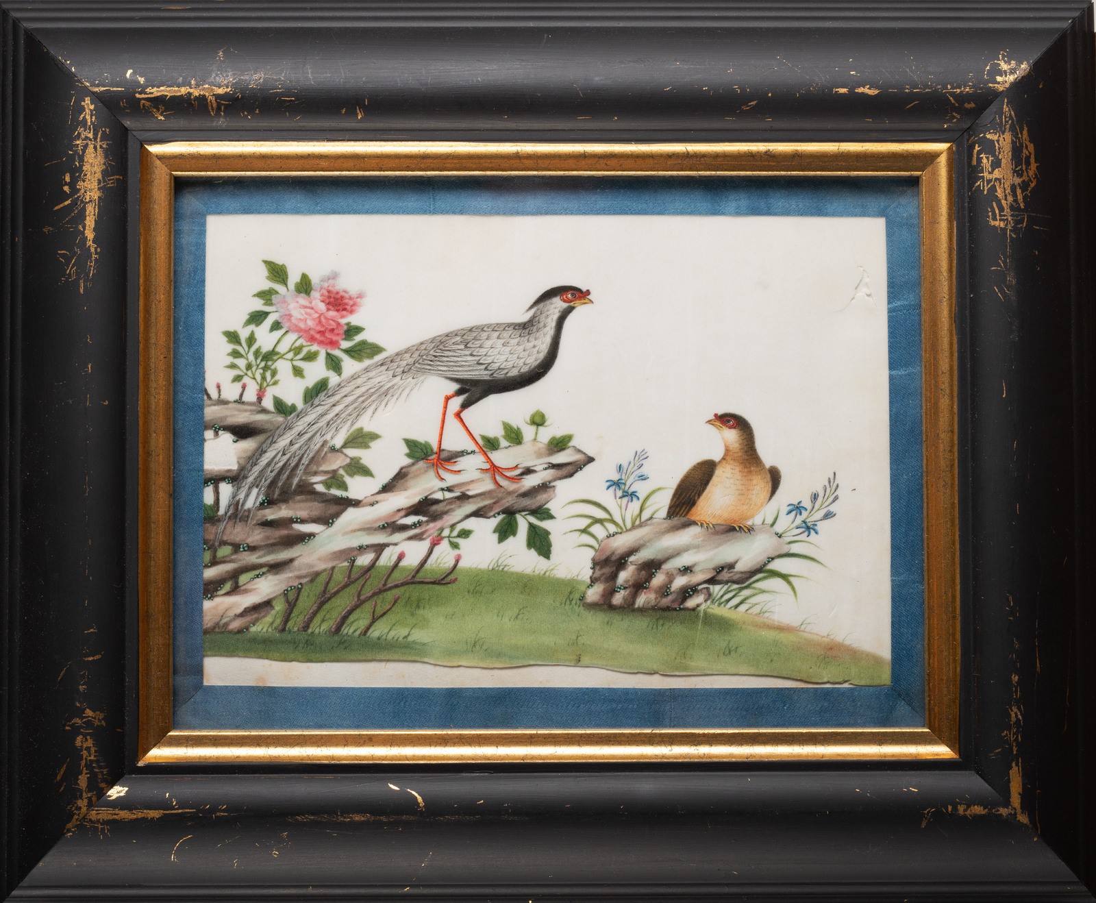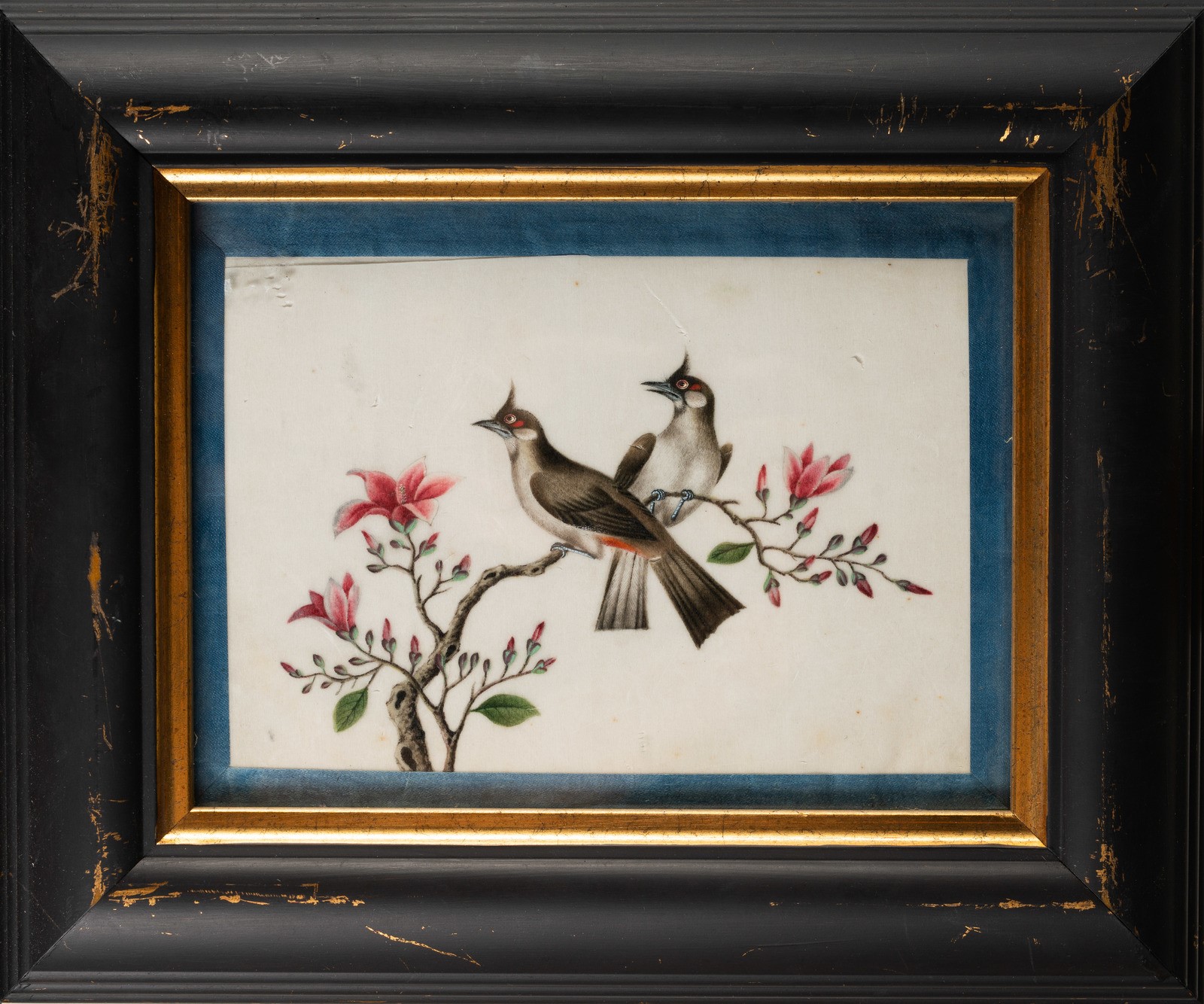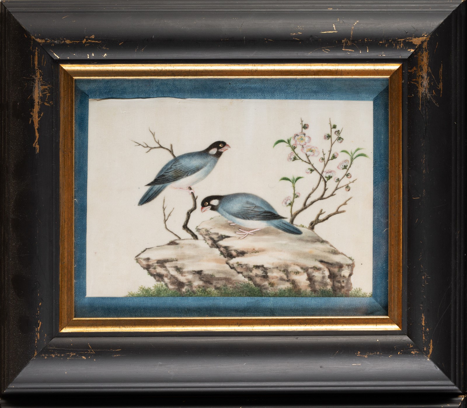 Chinese Art A set of six Canton paintings on pith paper depicting birds and flowers China, mid 19th century. . . depicting various birds among flowering shrubs. Frame present