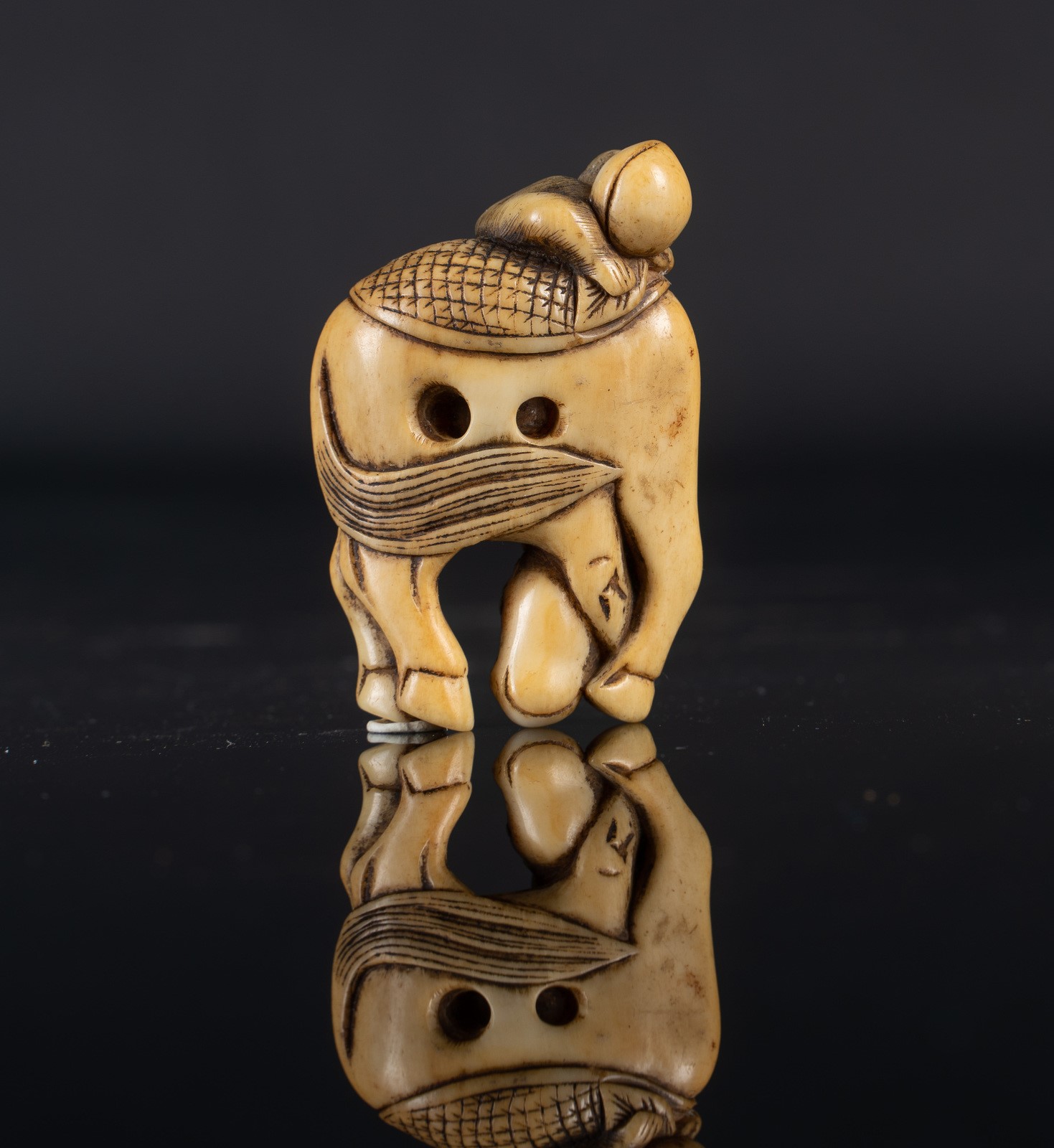 Japanese Art An ivory netsuke depicting a monkey riding a horse Japan, 19th century . . Cm 5,50.