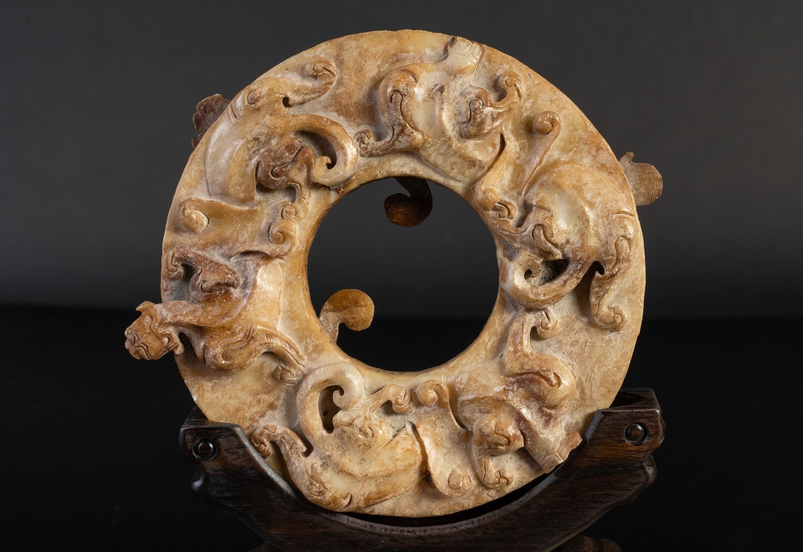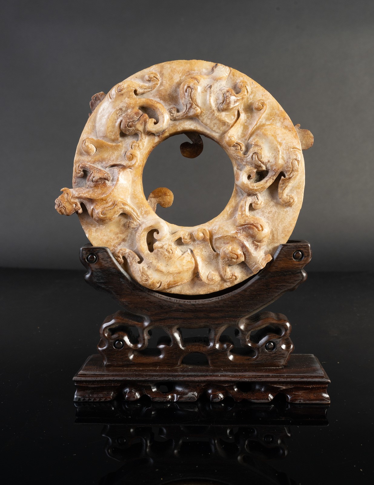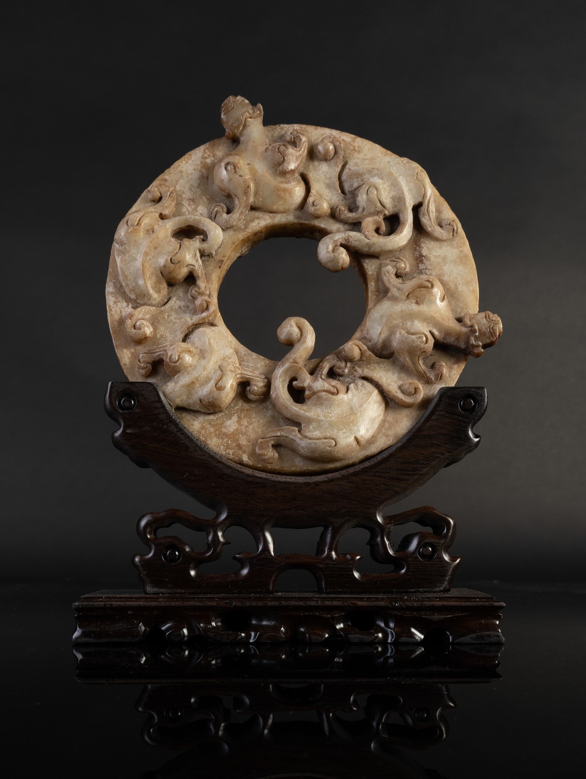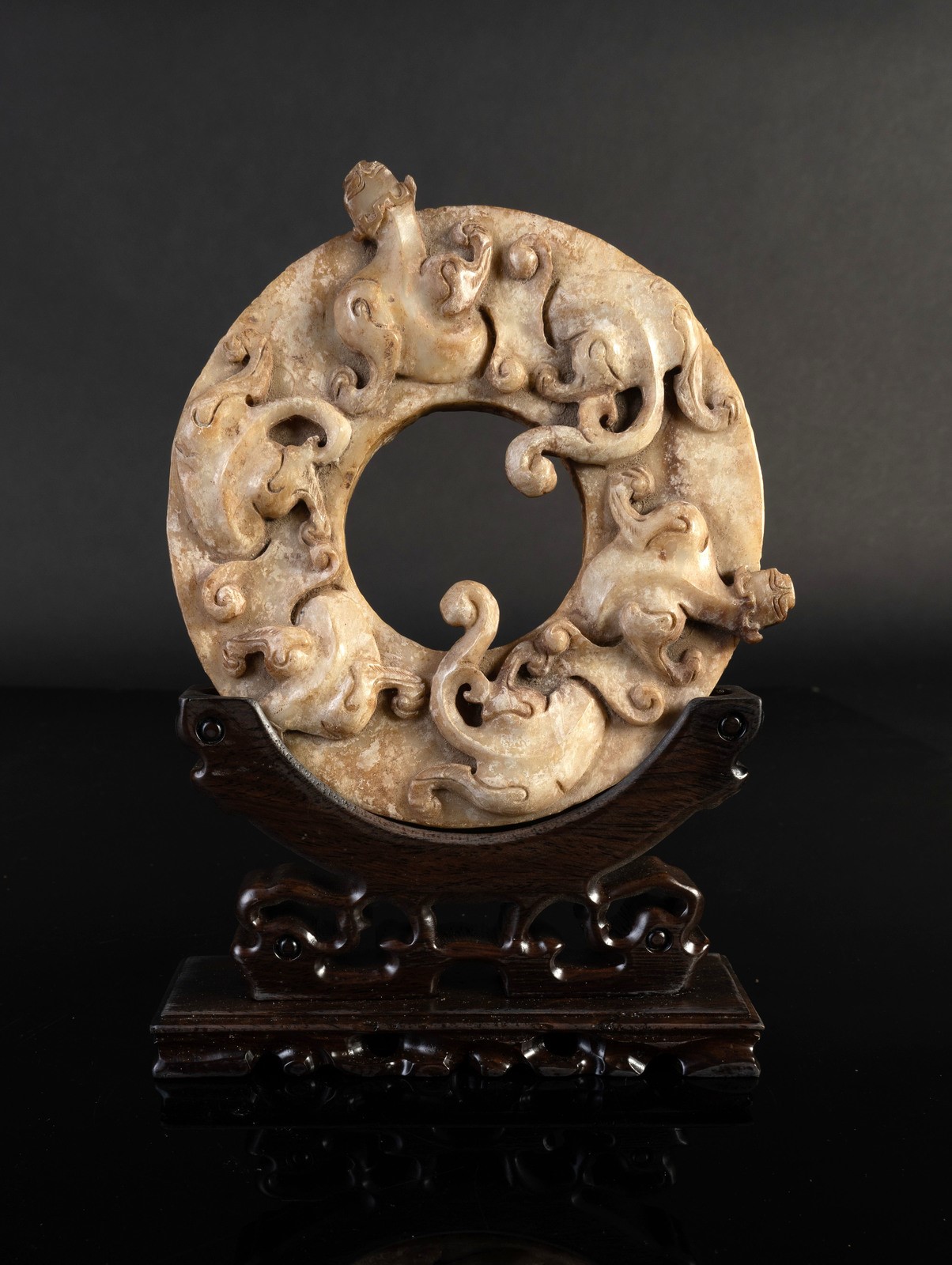 Chinese Art A pi white jade disc carved with tigers China, Qing dynasty, 19th century . . Cm 18,00 x 22,50. Modern wooden stand.