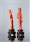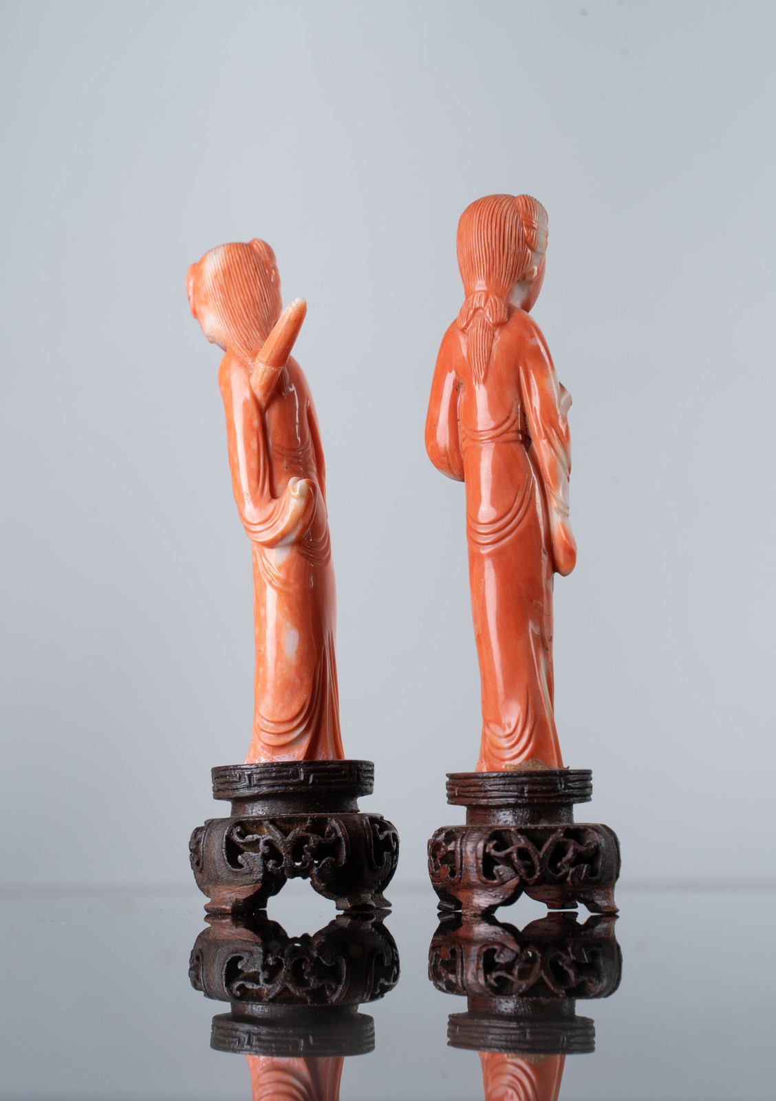 Chinese Art A pair of small coral carving depicting femail characters China, 19th century . . Cm 8,50. Openwork decorated round stand.