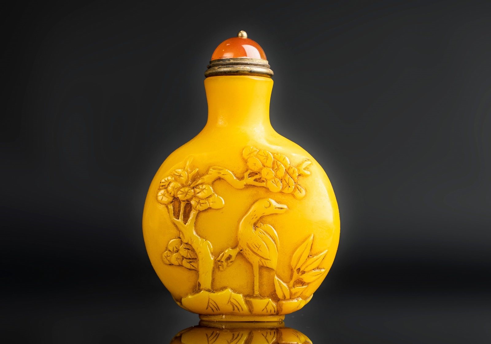 Chinese Art A yellow Pekin glass snuff bottle carved with Chinese pine and bird and bearing a three character mark at the baseChina, Qing dynasty, 19th century . . .