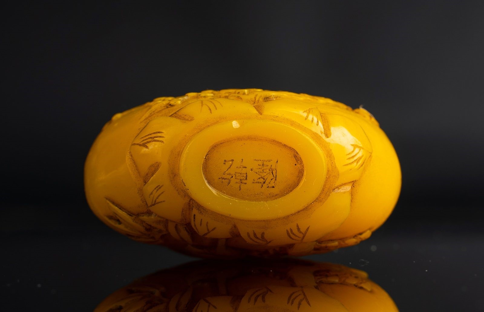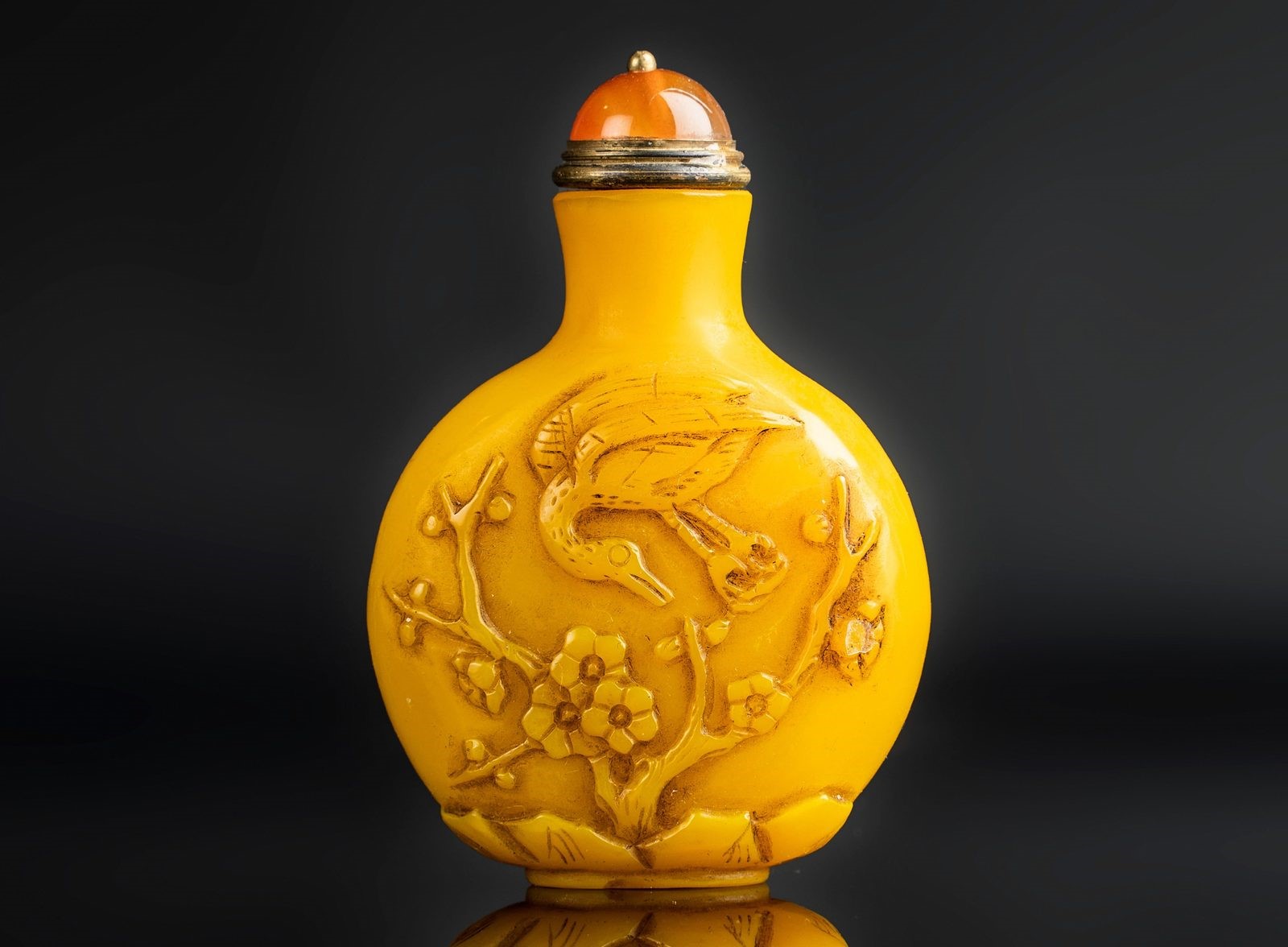 Arte Cinese A yellow Pekin glass snuff bottle carved with Chinese pine and bird and bearing a three character mark at the baseChina, Qing dynasty, 19th century .