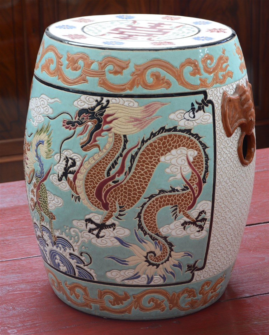 Sgabello in porcellana decorato con draghi, carattatteri e motivi di buon...