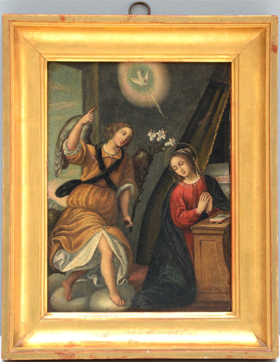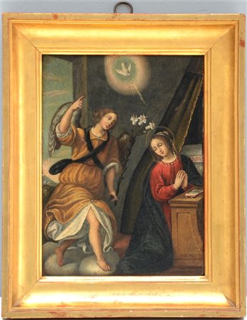 Scuola italiana del secolo XVIII "Annunciazione" olio su tavola (cm 24,2x17,5) in cornice (difetti e restauri)