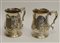 Due boccali in argento con manici sagomati e base tonda, punzoni di Londra (gr 1150)(sbalzati a fiori e volute in epoca posteriore) (difetti)