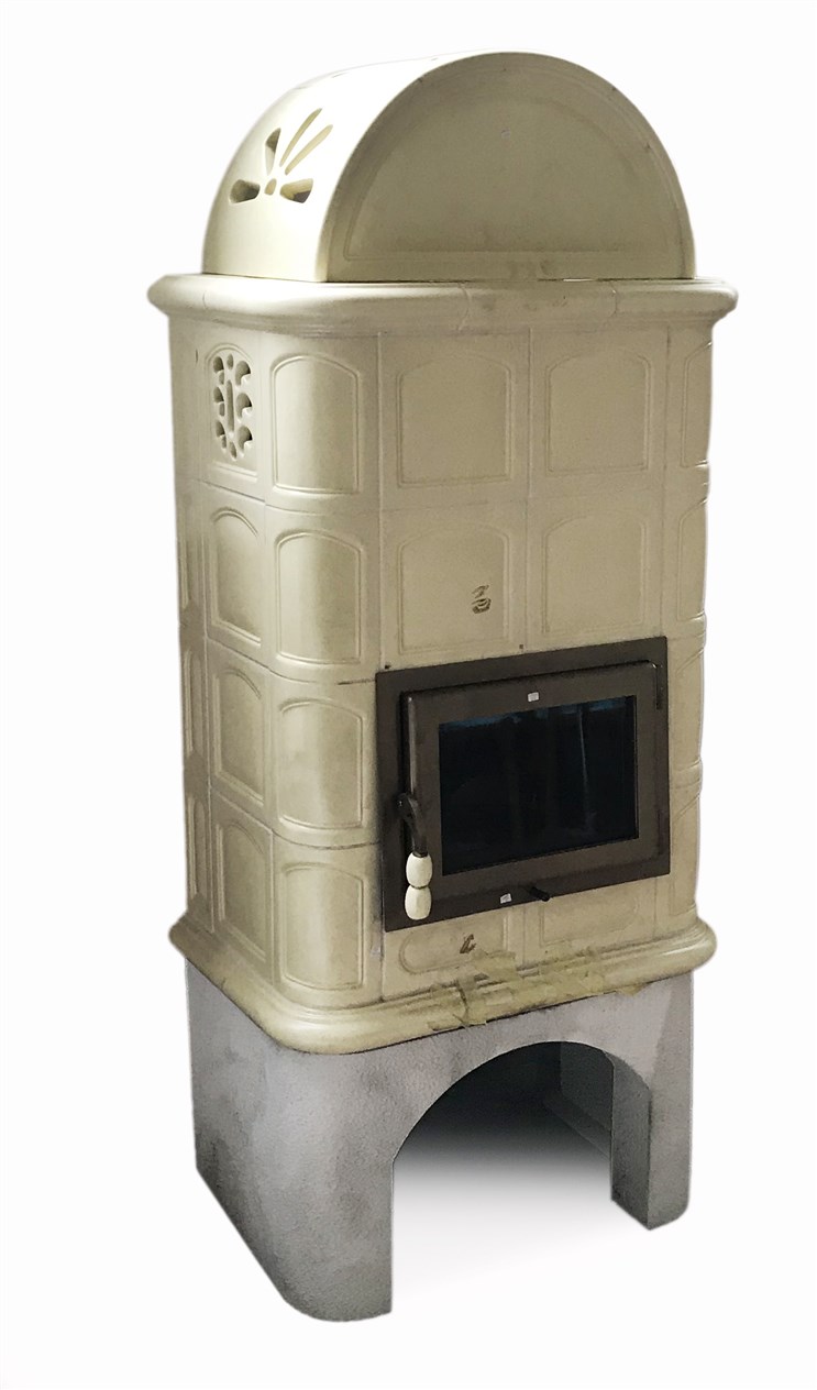 Stufa a legna in ceramica a tre elementi color avorio decorata a formelle centiate, base con vano portalegna (difetti)