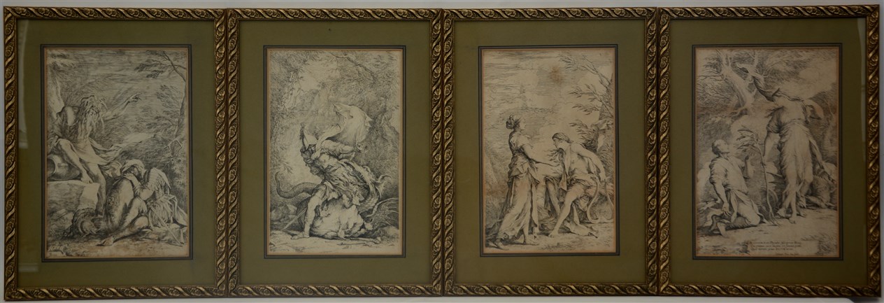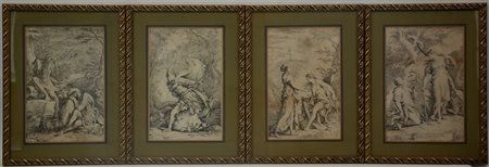 Gruppo di quattro antiche acquaforti da dipinti di Salvator Rosa (cm 36x24), in cornici