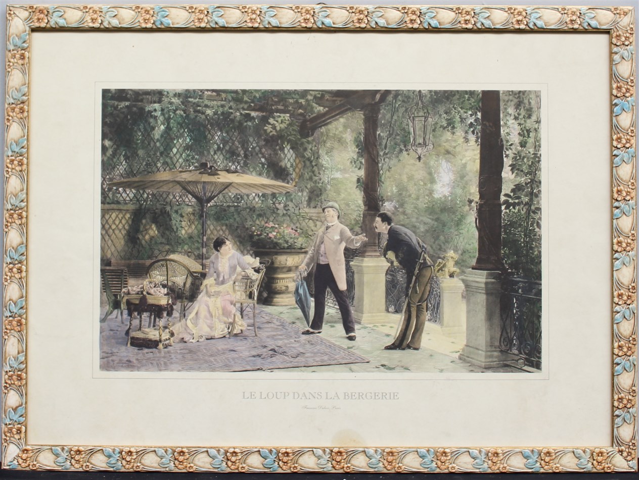 Gruppo di tre litografie a colori raffiguranti scene di genere (cm 70x50) in cornici