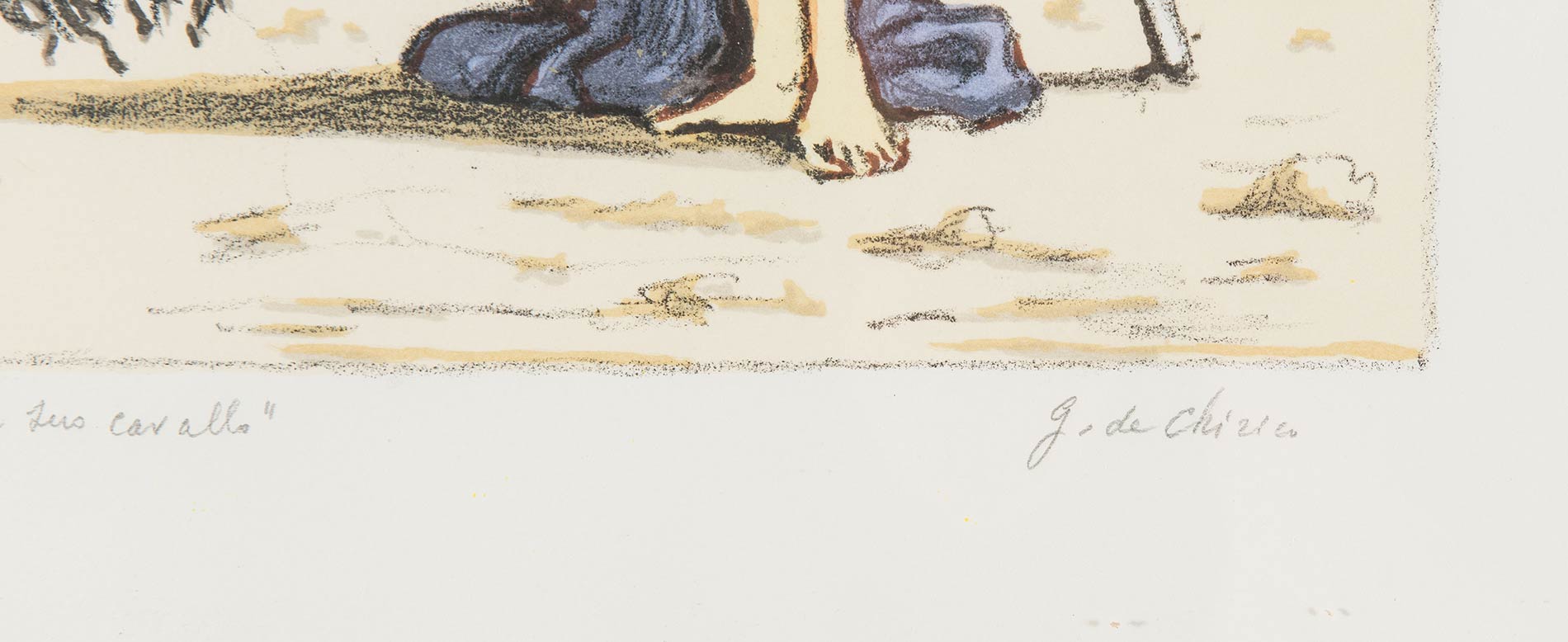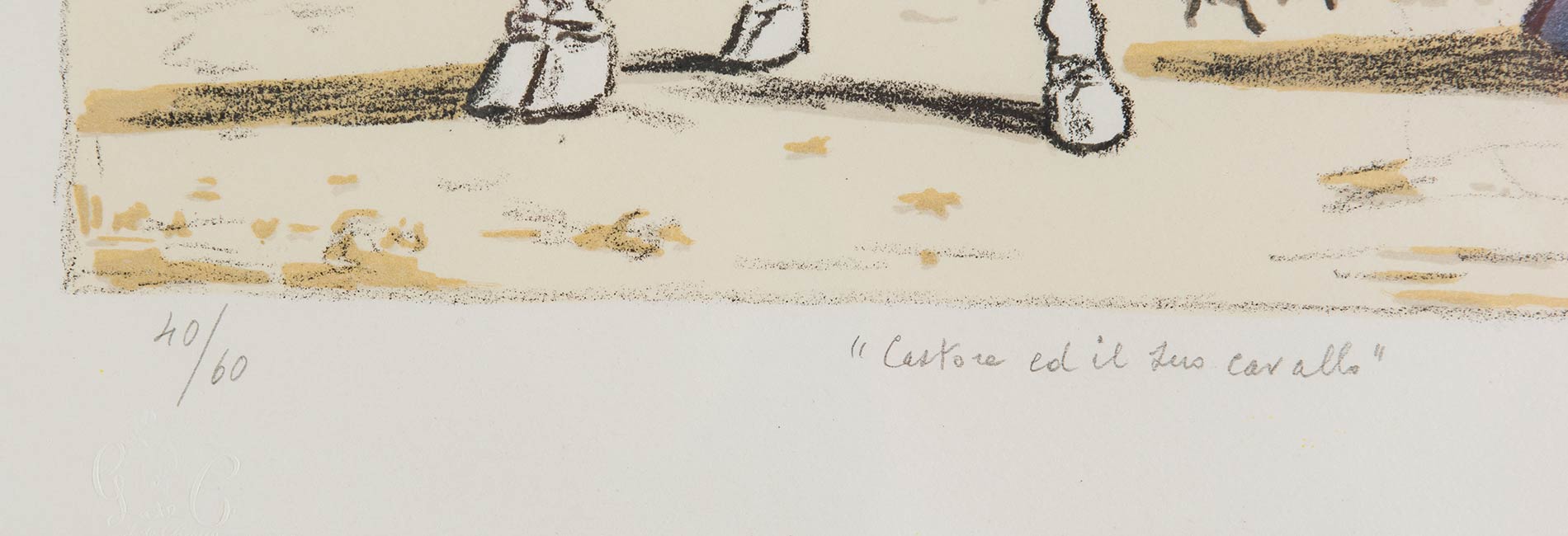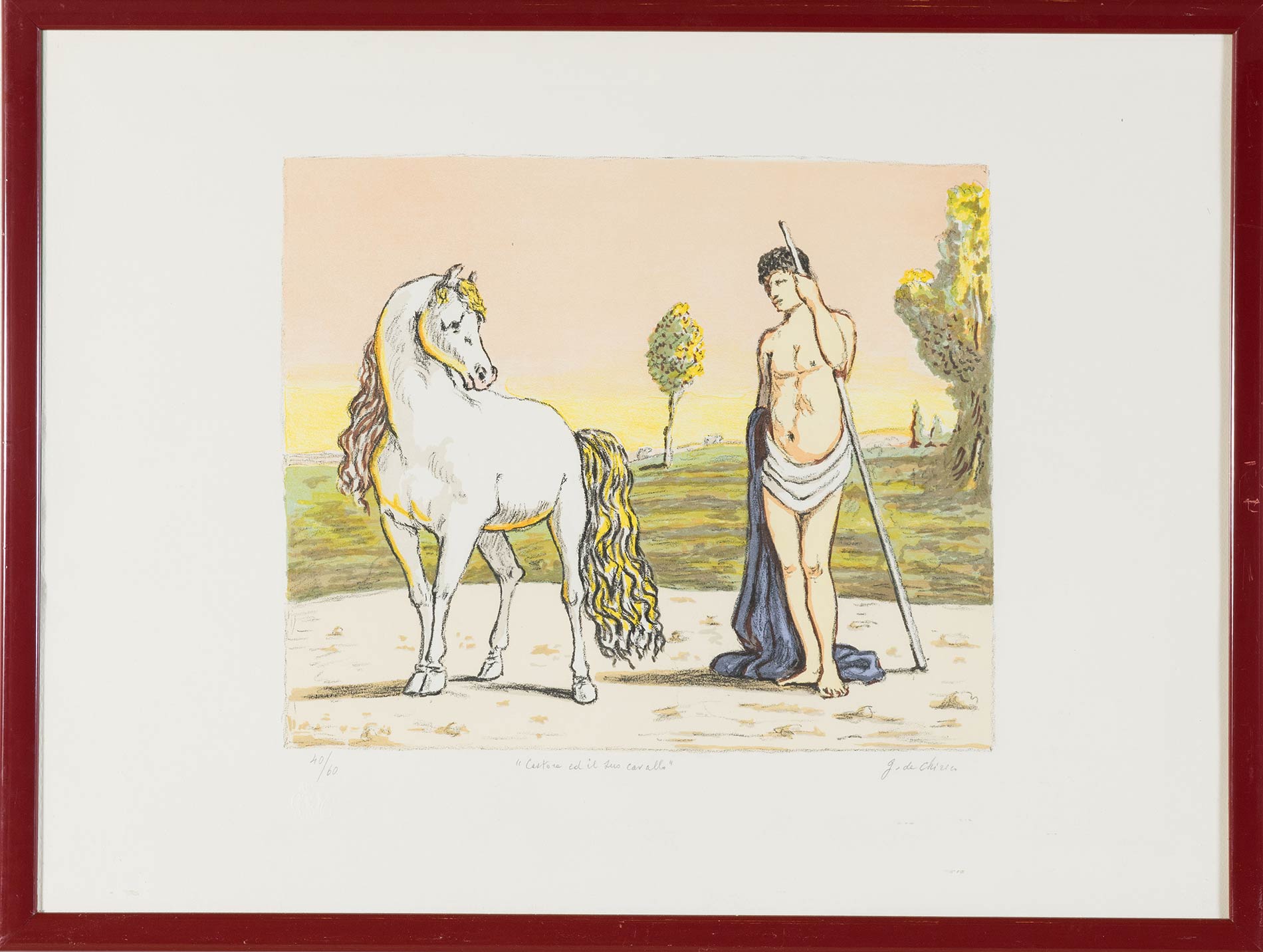 Litografia a colori su carta, firmata in basso a destra G. De Chirico, titolata in basso al centro ‘Castore e il suo cavallo’, numero di tiratura in basso a sinistra 40/60, reca timbro a secco in basso a destra Alberto Caprini Stampatore in Roma, reca timbro a secco in basso a sinistra GdeC, al retro reca iscrizione ‘pag. 129/op. 108’, Foglio H cm 51.5x69, Lastra H cm 34.5x40.5