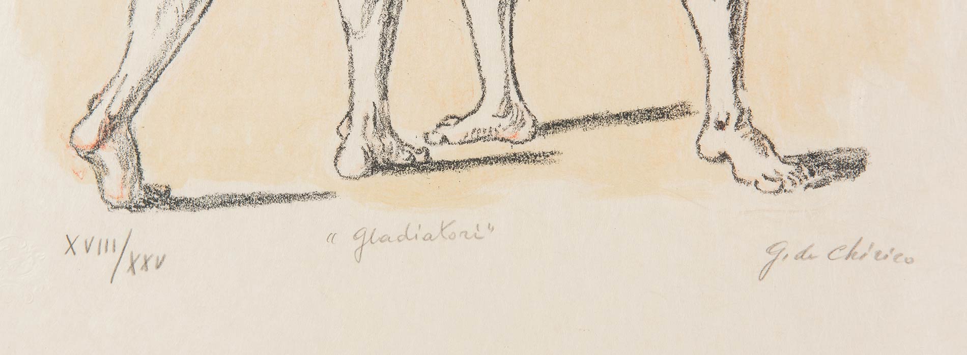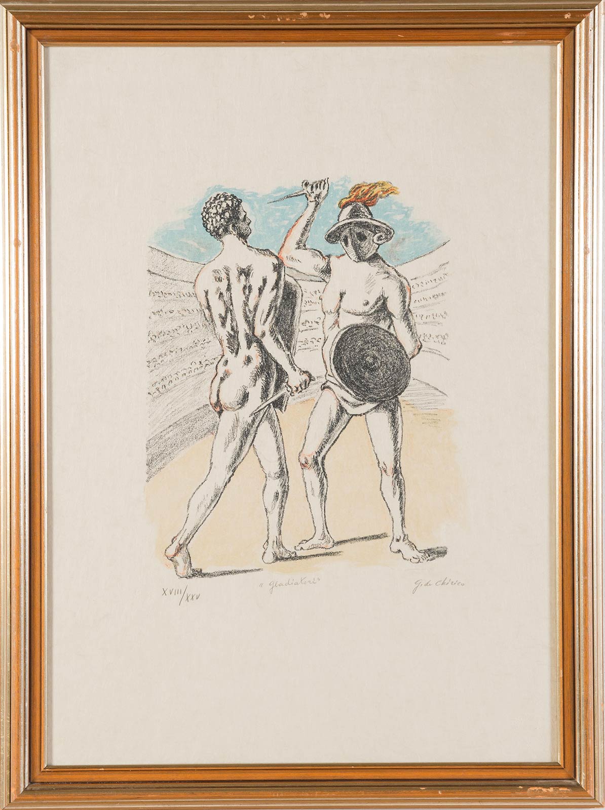 Litografia a colori su carta, firmata in basso a destra G. De Chirico, titolata in basso al centro ‘Gladiatori’, numero di tiratura in basso a sinistra XVIII/XXV, reca timbro a secco in basso a destra Alberto Caprini Stampatore in Roma, reca timbro a secco in basso a sinistra GdeC, al retro reca iscrizione ‘pag. 84/op. 66’, Foglio H cm 69x48.5, Lastra H cm 38x29