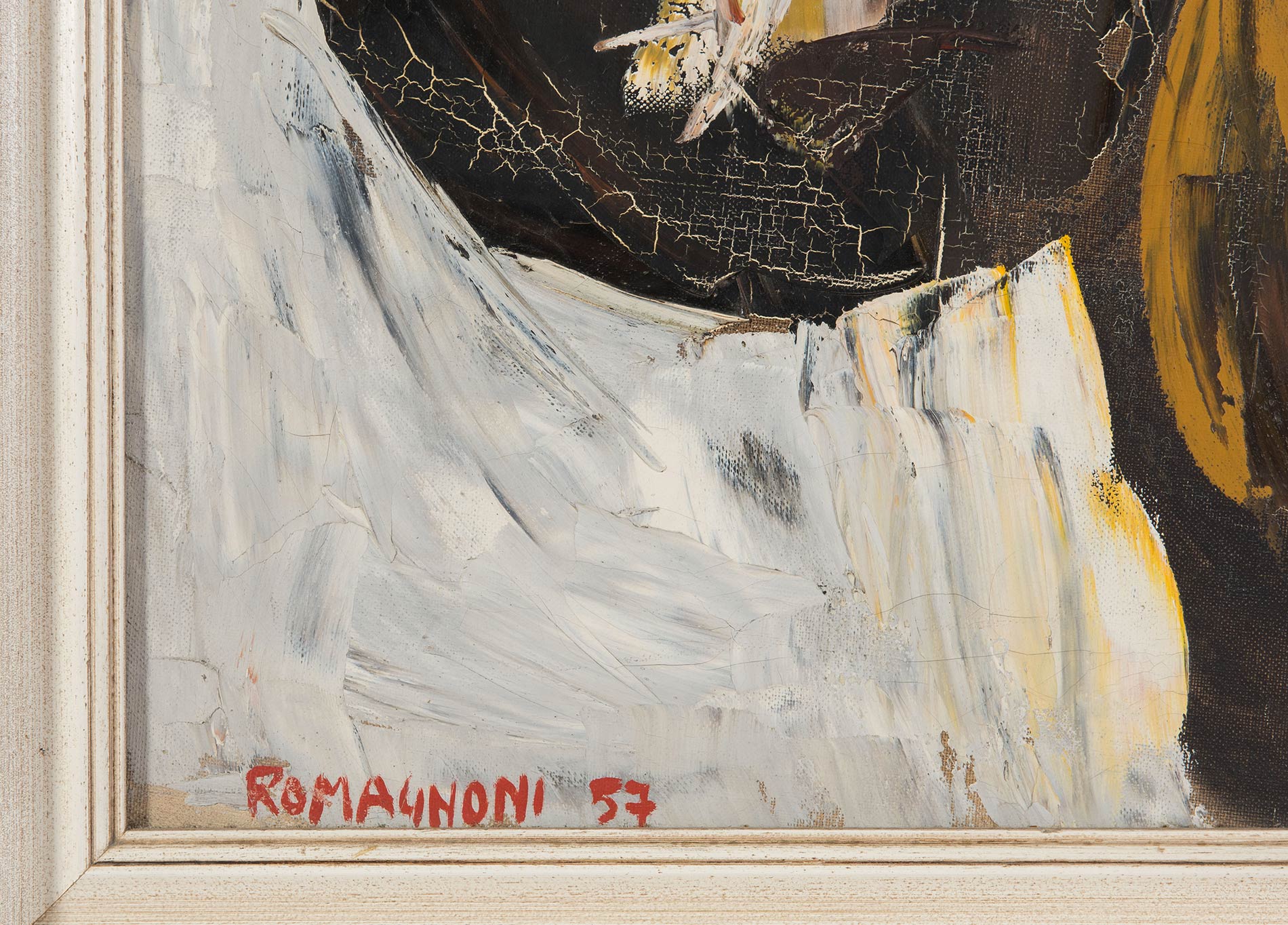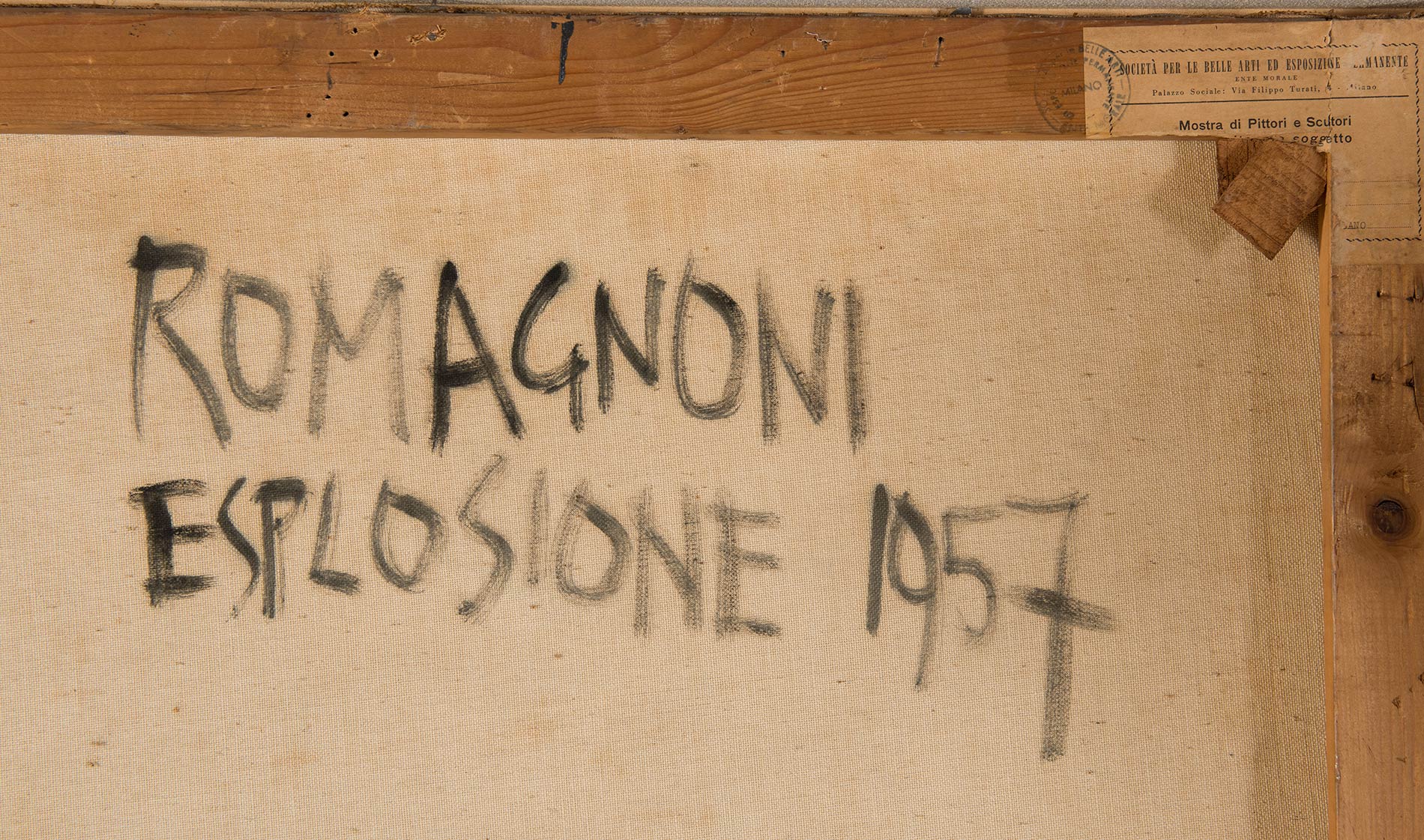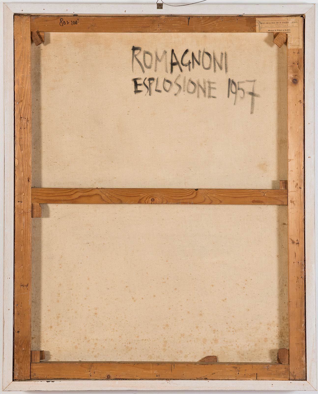 Olio su tela, firmato e datato in basso a sinistra Romagnoni 57, al retro firma, titolo e data ‘Romagnoni/Esplosione 1957’, H cm 100x80