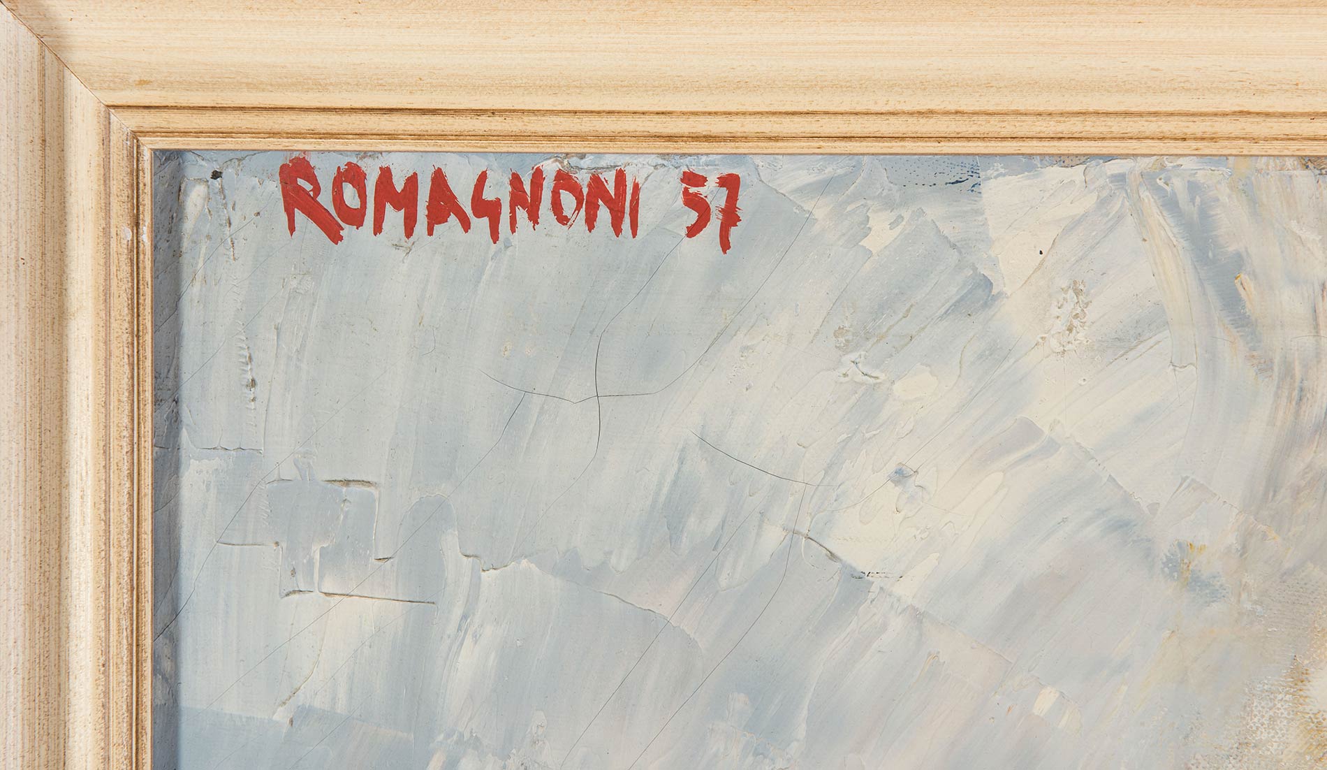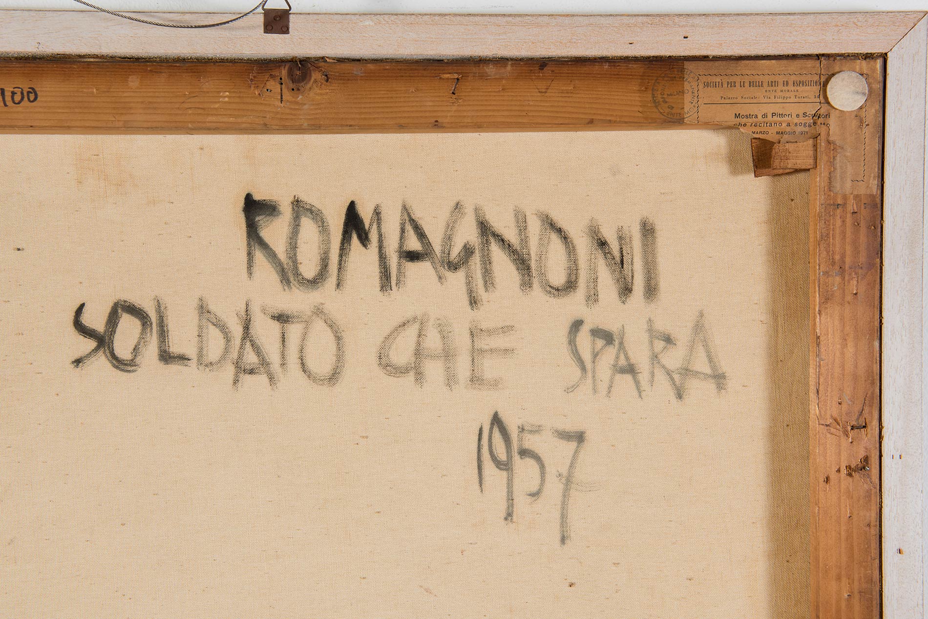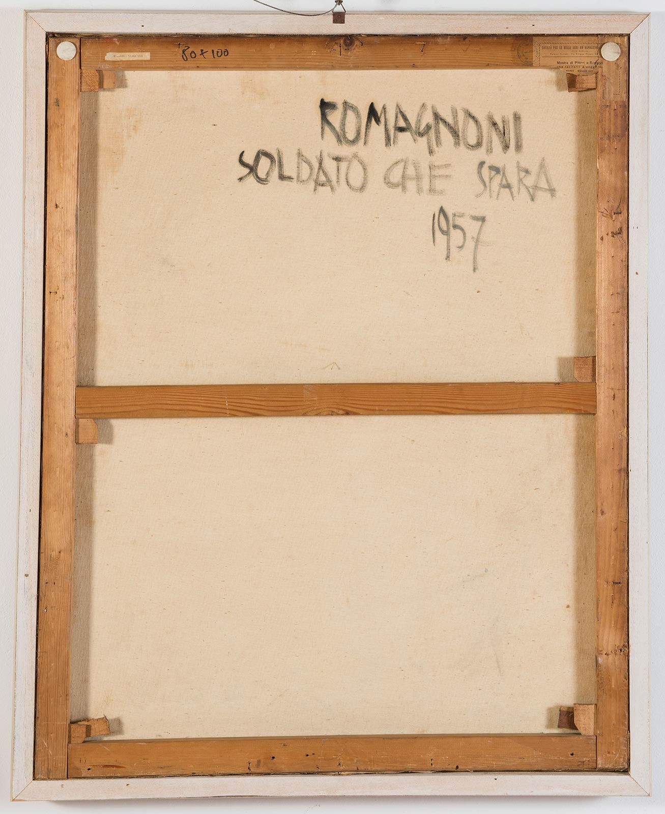 Olio su tela, firmato e datato in alto a sinistra Romagnoni 57, al retro firma, titolo e data ‘Romagnoni/Soldato che spara 1957’, H cm 120x80