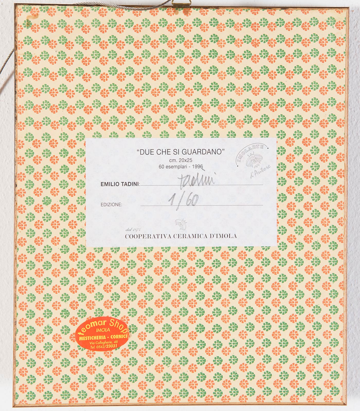Formella in ceramica, esemplare 1/60, al retro etichetta con firma Tadini, numero di tiratura e marchio Imolarte - Sezione Artistica della Cooperativa Ceramica d’Imola, H cm 25x20