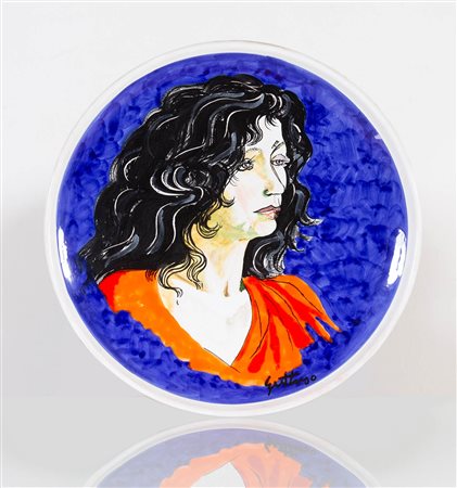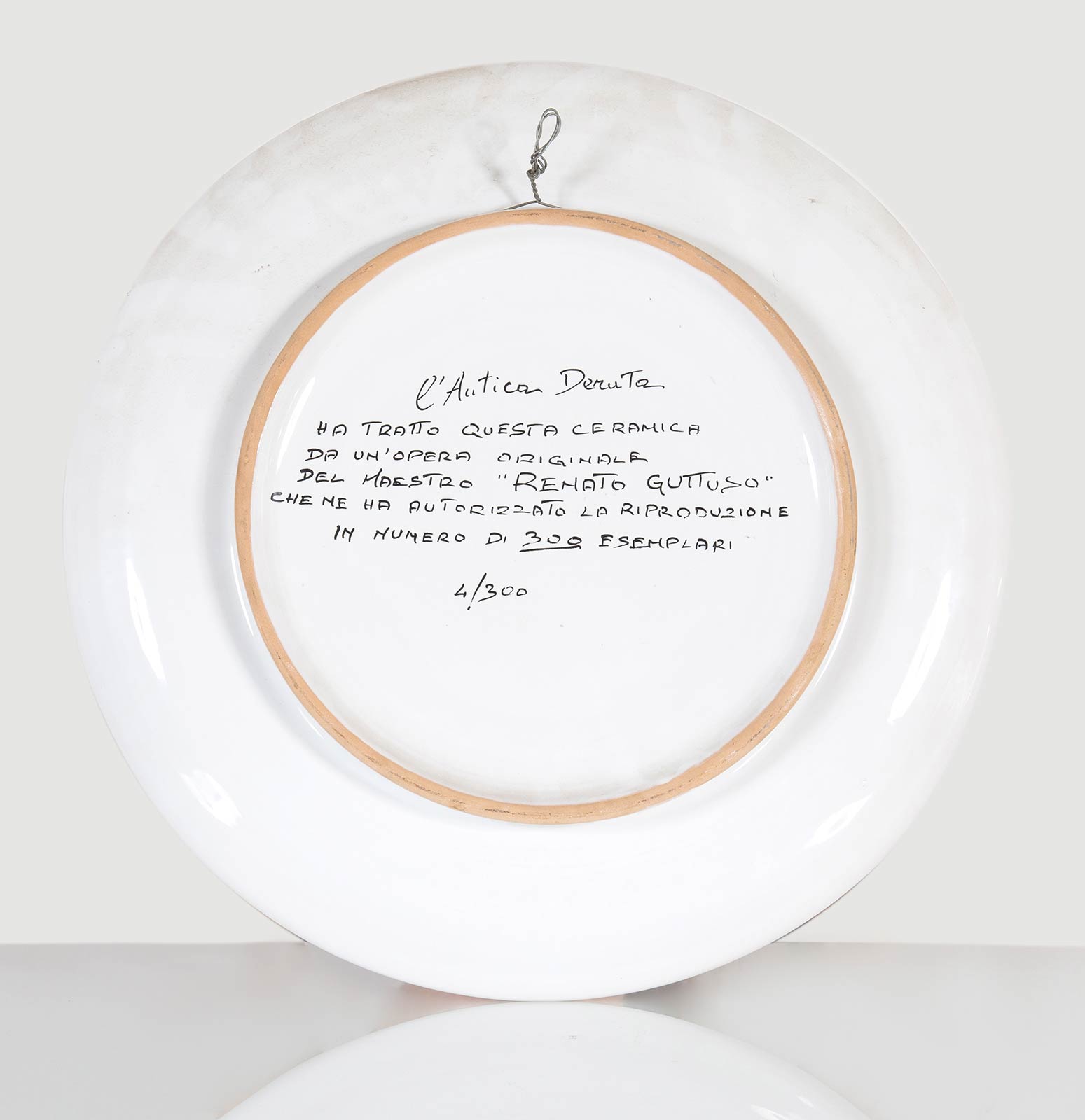 Piatto in ceramica Deruta, firma in basso a destra Guttuso, al retro reca iscrizione della Manifattura e numero di tiratura 4/300, diametro cm 40