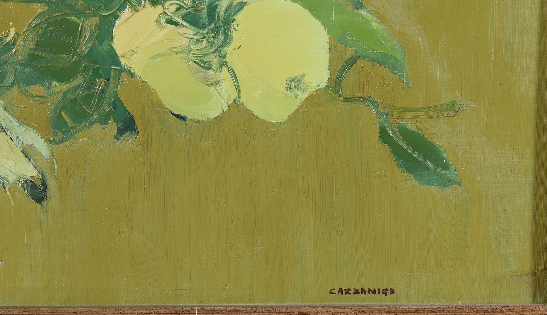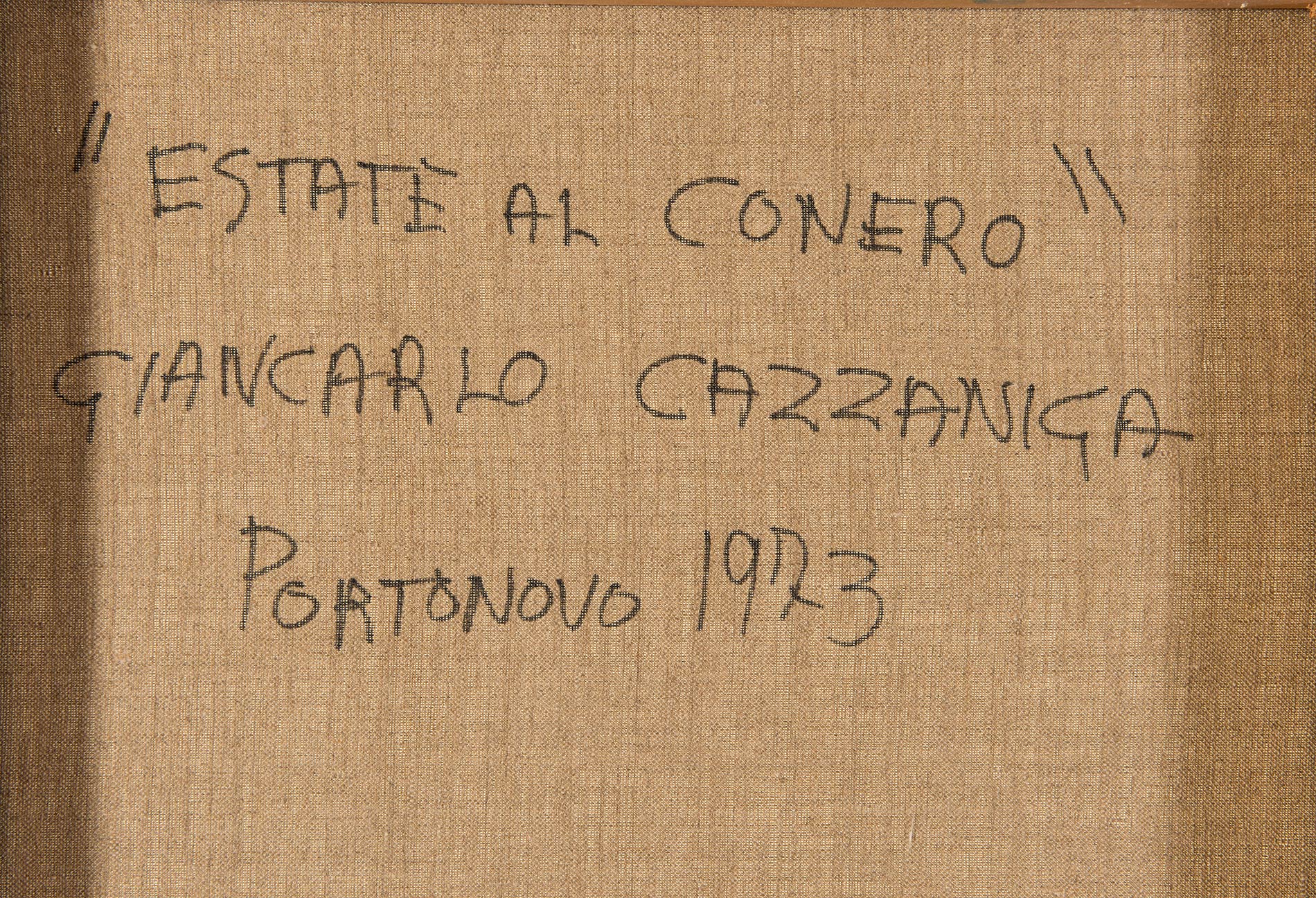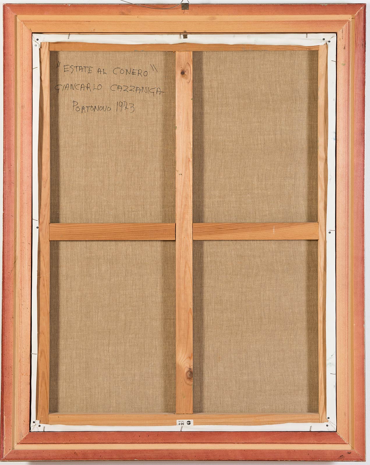 Olio su tela, firmato in basso a destra Cazzaniga, al retro reca titolo, firma e data ‘Estate al Conero/Giancarlo Cazzaniga/Portonovo 1973’, H cm 116x89