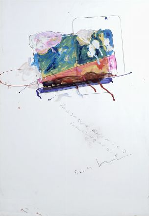Mario Schifano (Homs, 1934 - Roma, 1998) Paesaggio anemico, 1973-78 Smalto e collage su cartoncino, cm. 100x70 Firma, titolo e dedica in basso a destra. Certificato Archivio Mario Schifano, n.00853080223.