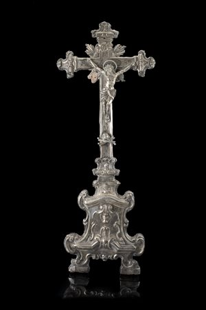 Crocifisso da appoggio in argento con supporto in legno; base trapezioidale e canti modellati a cornice sagomata con modanature e volute foliate. Regno di Napoli, 1766 (h. cm 45 ca.) (difetti)