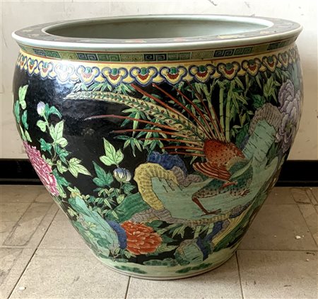 Vasca per pesci in porcellana decorata a smalti policromi su fondo nero a motivi floreali (diam. 47) (lievi difetti)