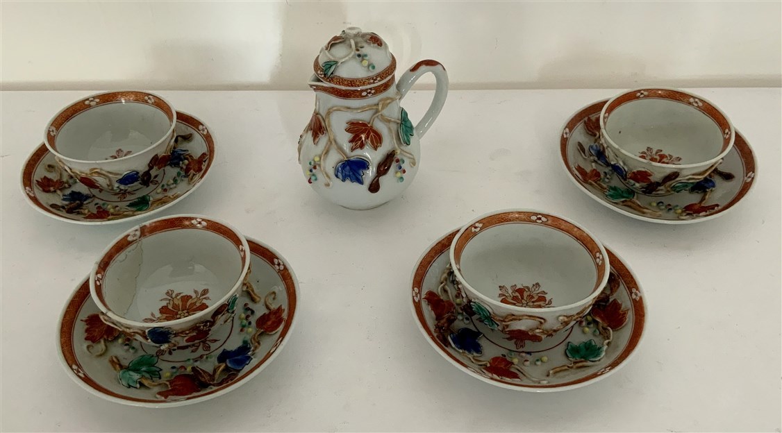 Gruppo di quattro tazzine, quattro piattini e una lattiera con coperchio in porcellana a smalti policromi con decorazioni di scoiattoli e grappoli d'uva in rilievo (difetti e restauri)