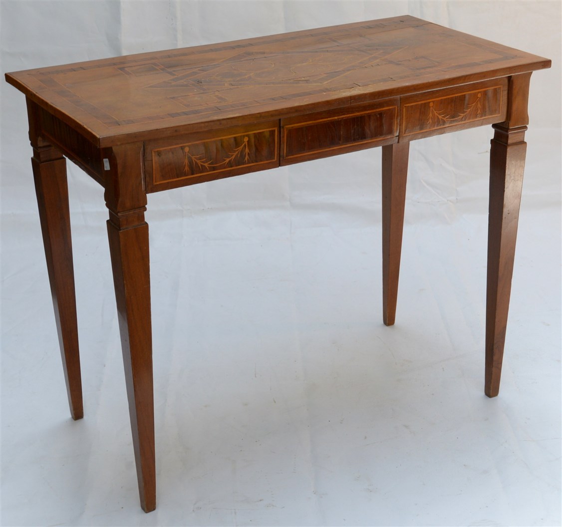 Scrittoio lastronato in noce e intarsiato sul piano a motivo geometrico e volute, fascia ad un cassetto filettata in legno chiaro, gambe rastremate. Rolo, inizio secolo XIX (cm 92x7447) (difetti)