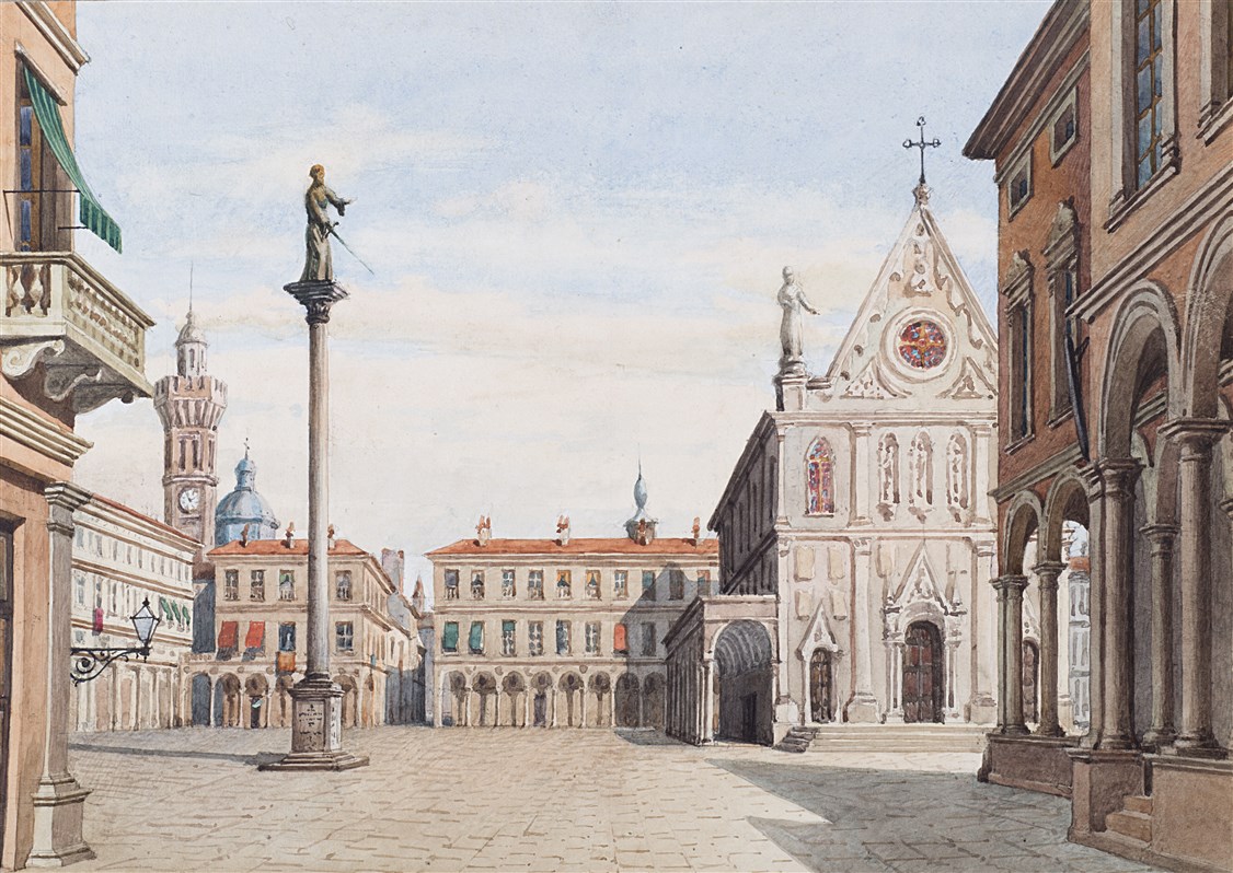 (attributed) "Stage set design: Town Square with churches, palaces and columns" watercolours over traces in pencil (mm 198x278) framed