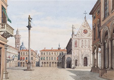 (attr.) "Scenografia: Piazza di città con chiese, palazzi e colonne" acquerelli su tracce a matita (mm 198x278) In cornice