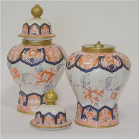 Coppia di vasi con coperchio in porcellana policroma stile Imari. Giapponese, periodo Meiji (1868-1912) (h. cm. 50) (difetti)
