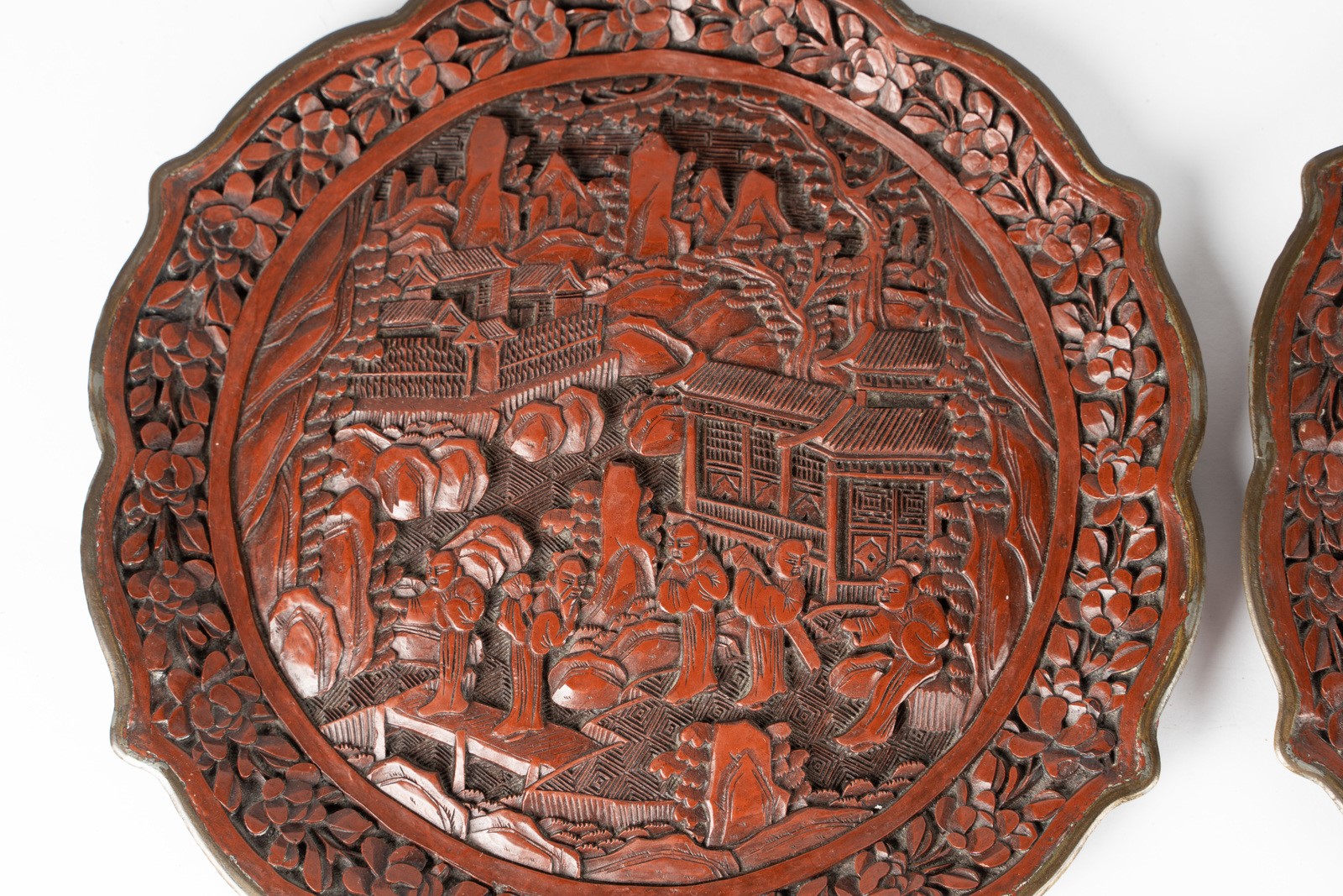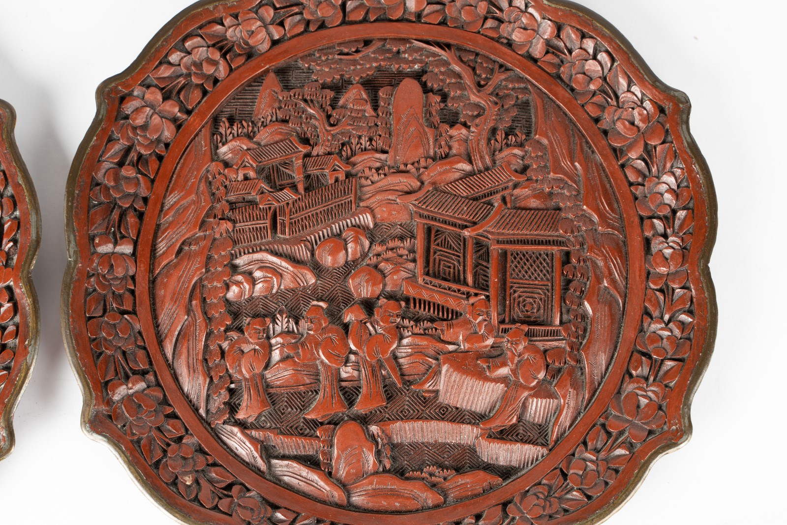Arte Cinese A pair of red lacqer dishes carved with courtly scenes and bearing a spurious Qianlong mark at the base China, Qing dynasty, 19th century .