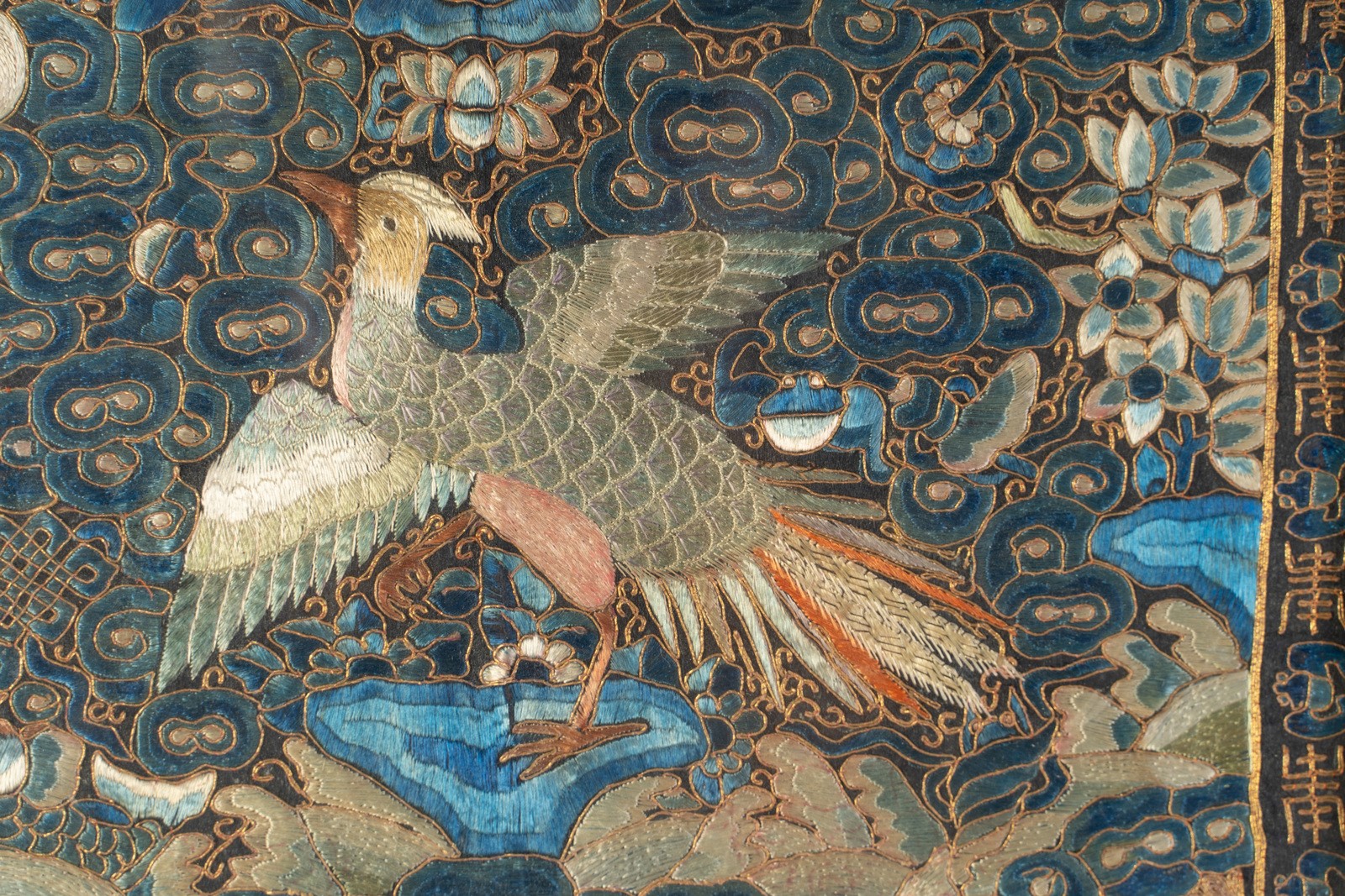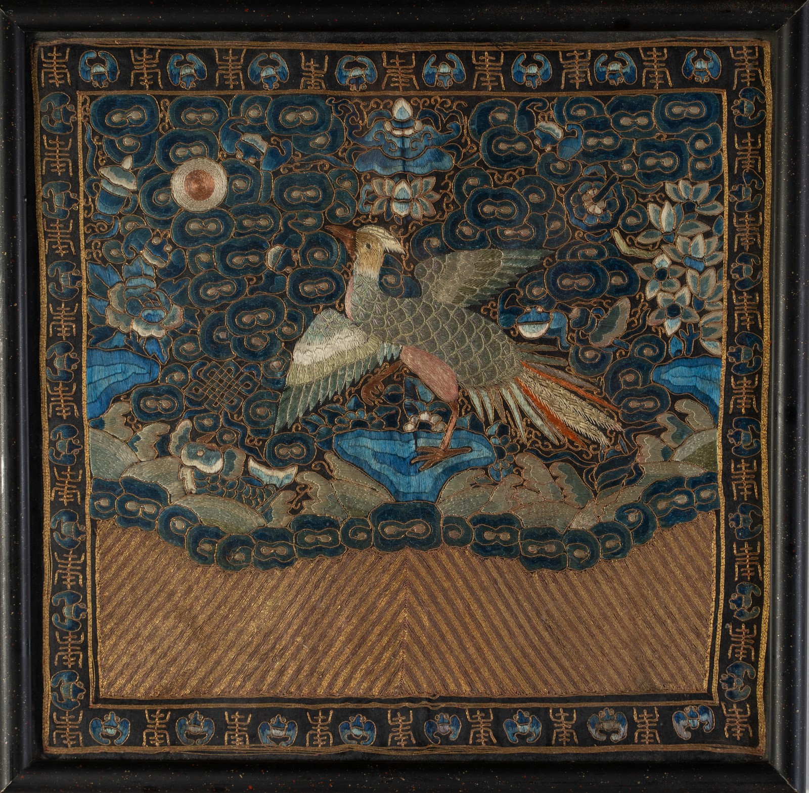 Arte Cinese A badge silk fabric embroidered with a phoenix among clouds China, Qing dynasty, 19th century .