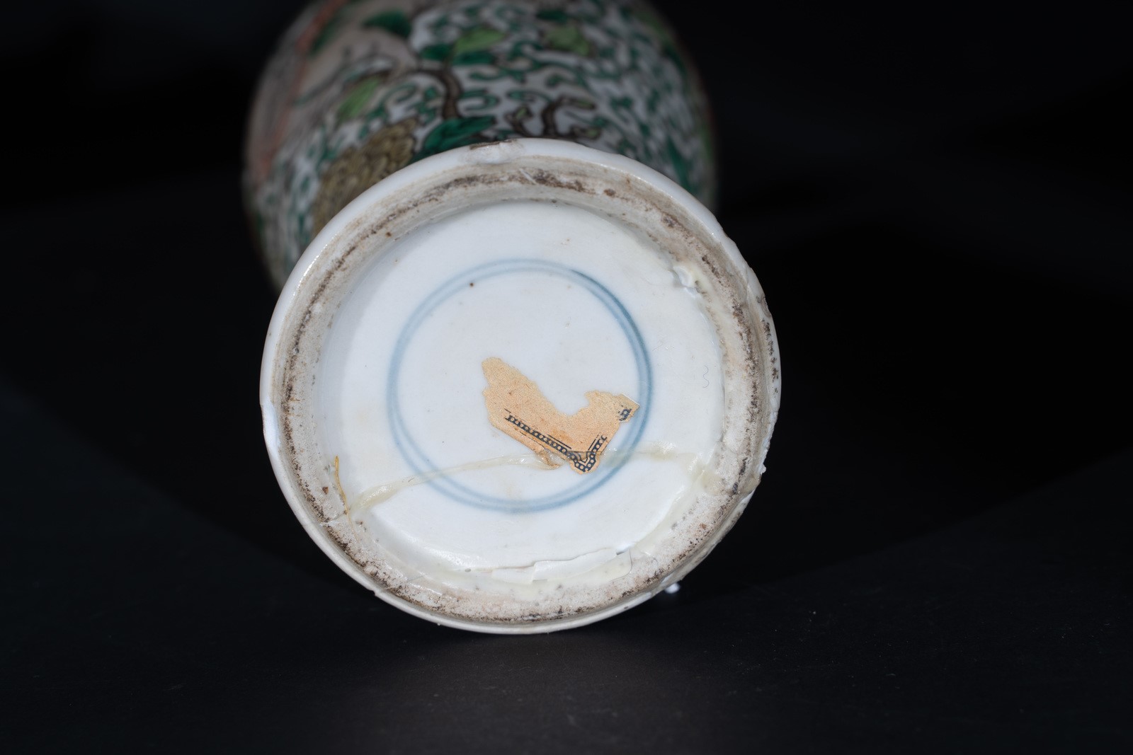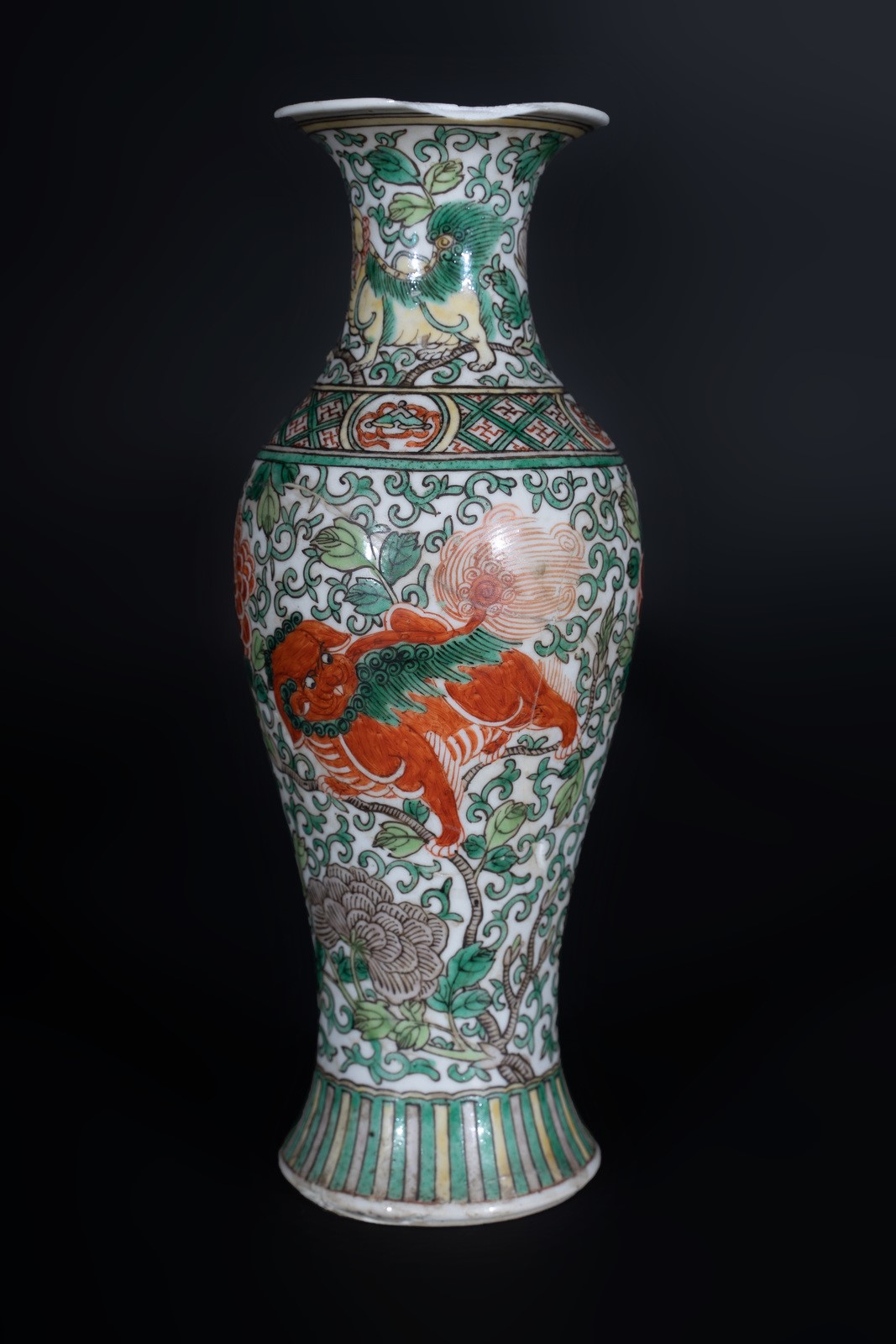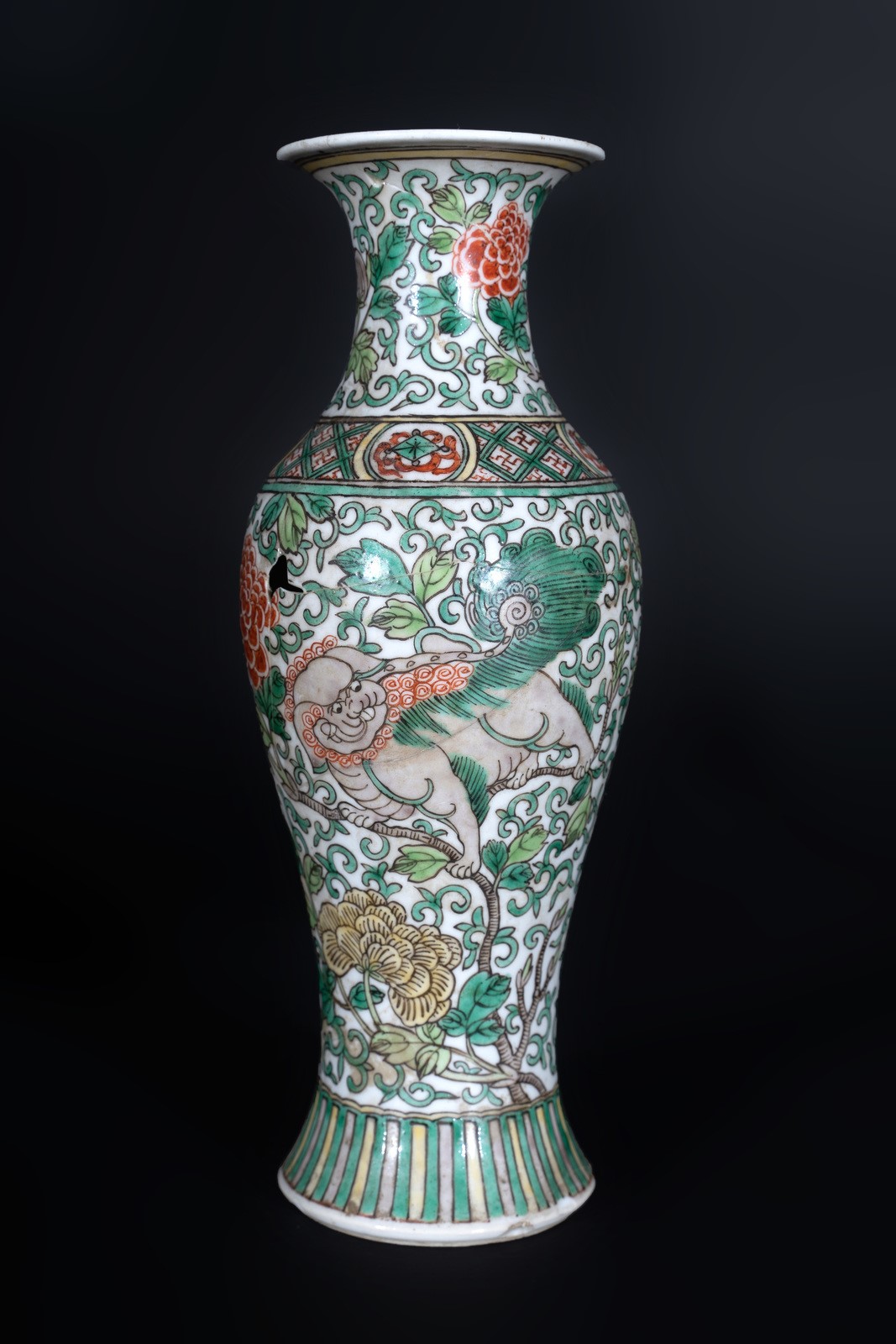 Chinese Art A wucai porcelain baluster vase painted with pho dogs among sprays and bearing a double circle mark at the base China, Qing dynasty, Kangxi period (r. 1661-1722). . Cm 9,00 x 30,00. Chip with missing piece at the neck and minor chips.