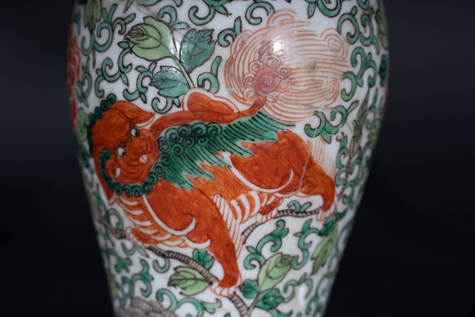 Arte Cinese A wucai porcelain baluster vase painted with pho dogs among sprays and bearing a double circle mark at the base China, Qing dynasty, Kangxi period (r. 1661-1722).