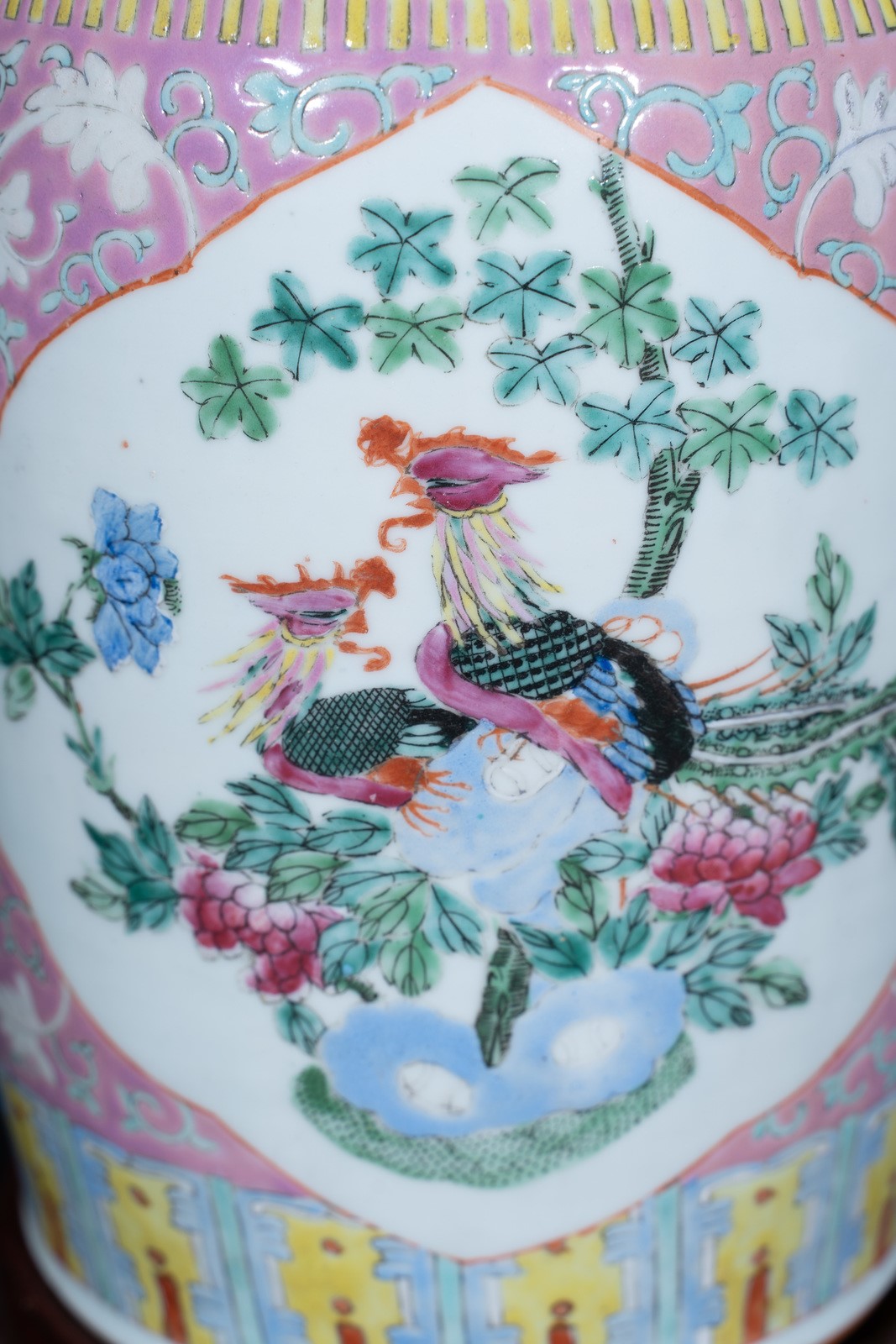 Chinese Art A porcelain vase painted with birds within reservesChina, 20th century . . Cm 43,00. Wooden stand.