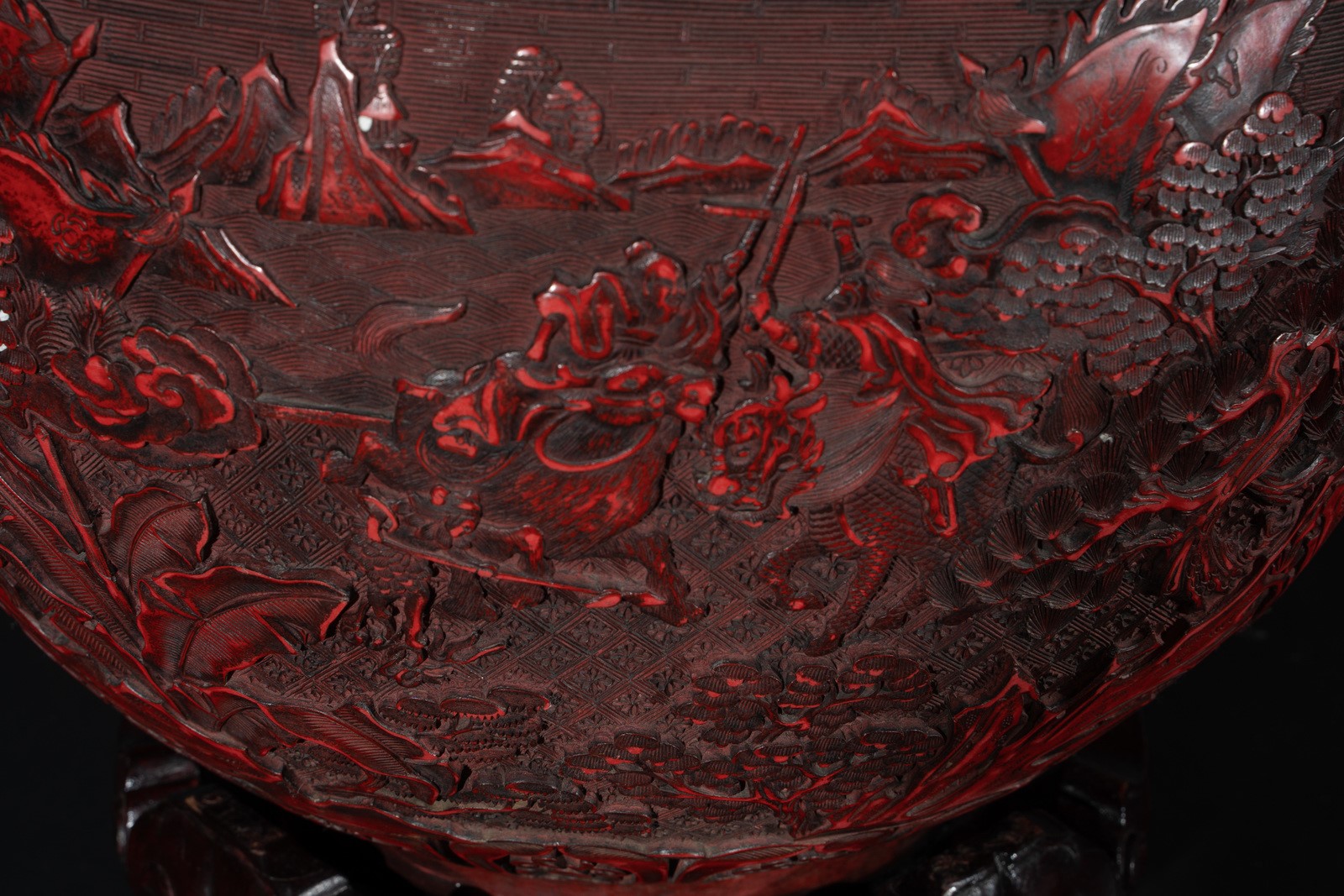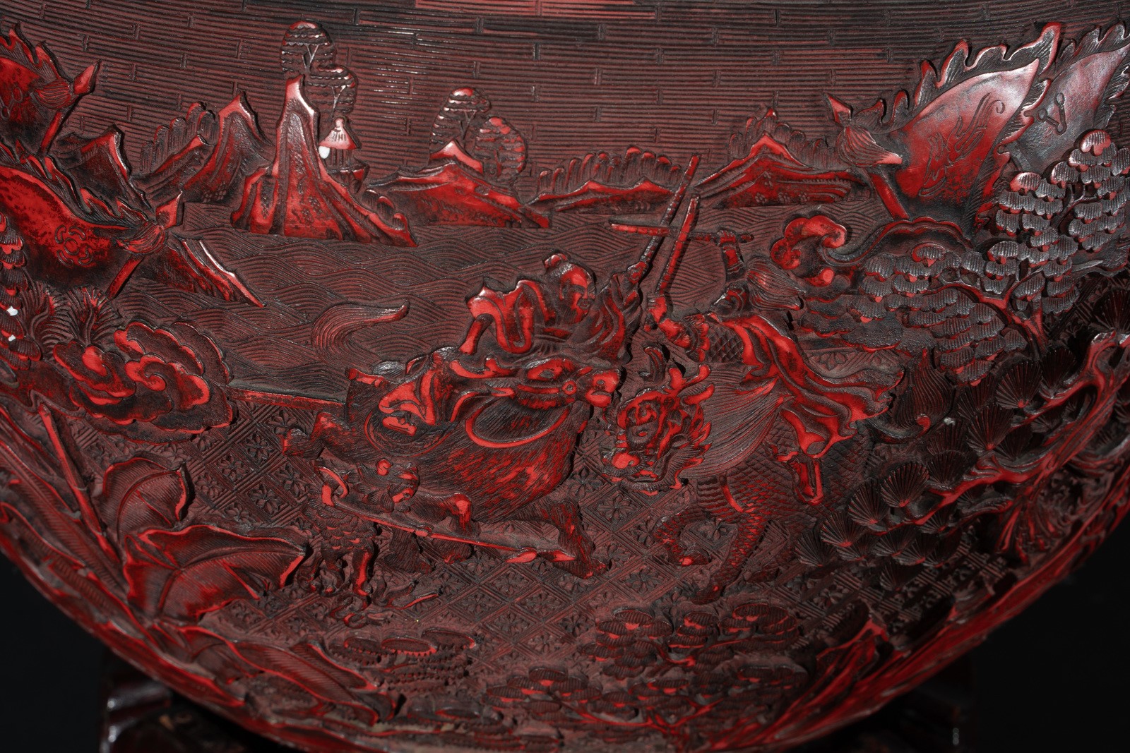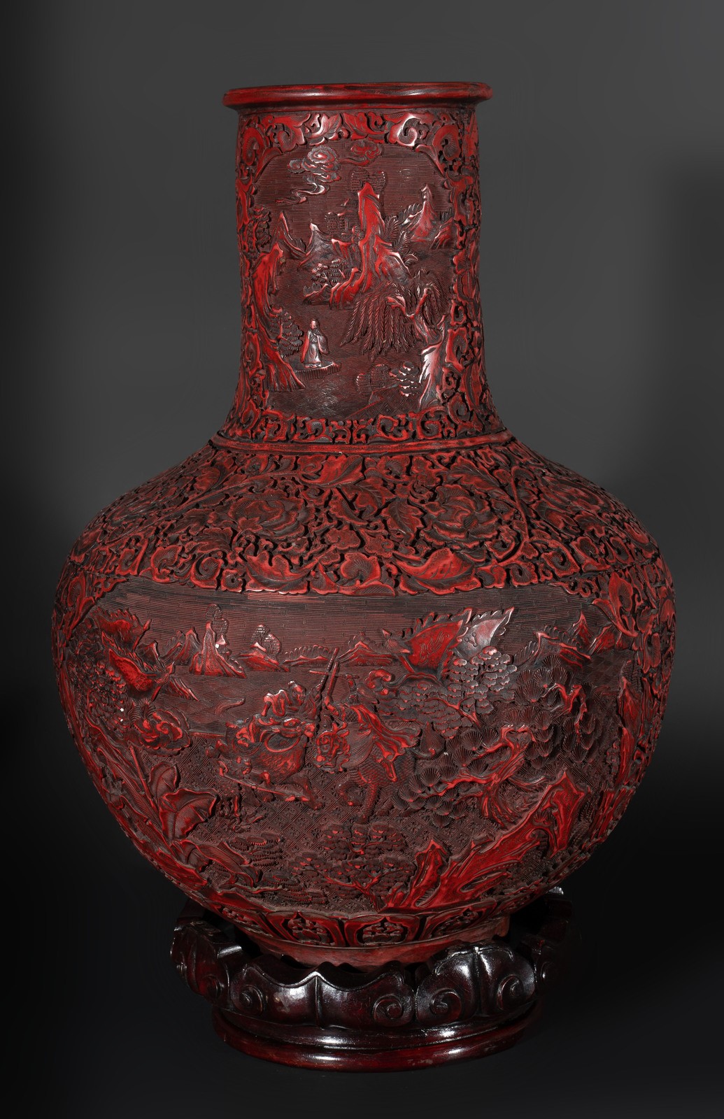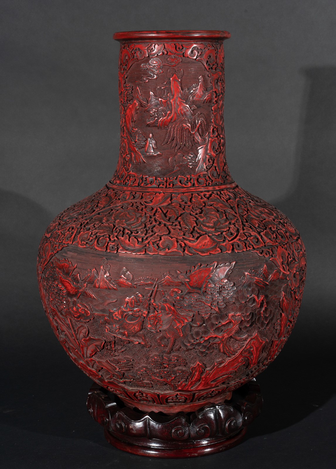 Chinese Art A large red lacquer vase carved with landscape and war contest China, 20th century . . Cm 46,00 x 62,00.