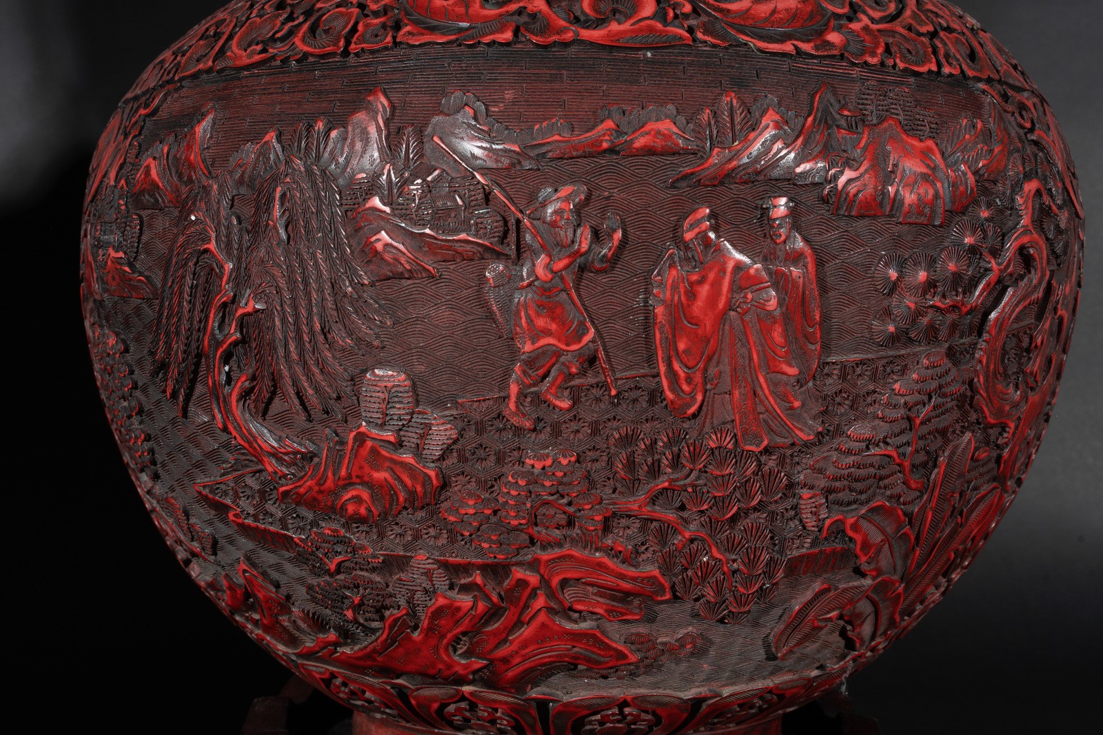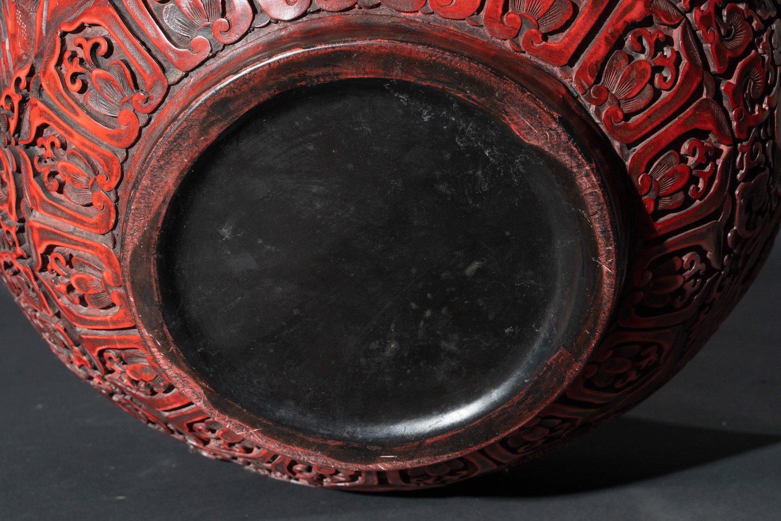 Arte Cinese A large red lacquer vase carved with landscape and war contest China, 20th century .