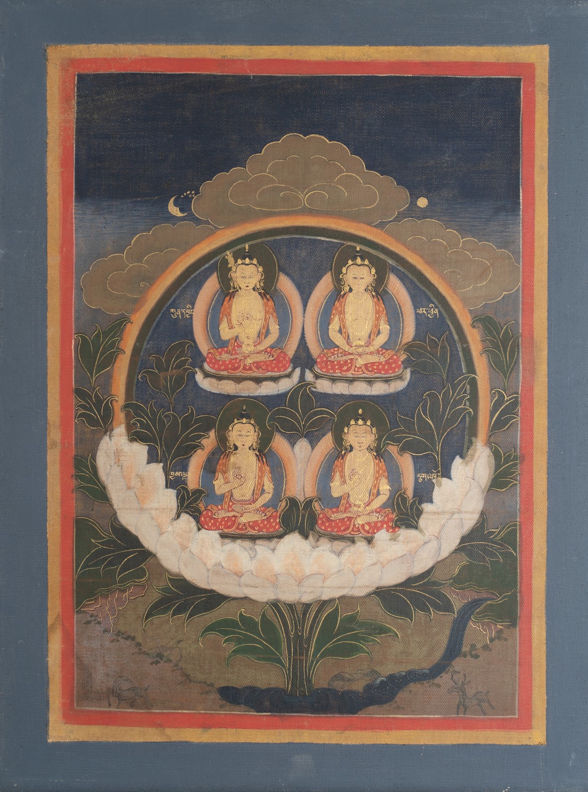 Himalayan Art Thangka depicting four Bodhisattvas Tibet, 18th-19th century . . Cm 28,50 x 39,50. Frame present