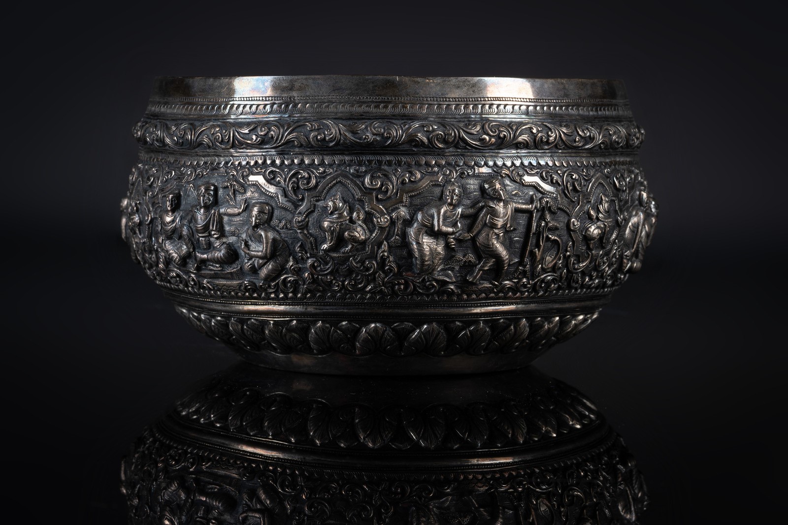 South-Est Asian Art An embossed silver bowl decorated with lively scenes Burma, 19th century . . .