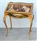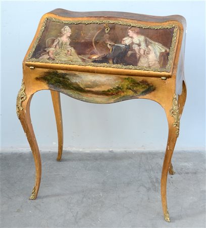 Piccola ribalta dorata di forma mossa con grembiale e fianchi dipinti a paesaggi e anta dipinta a scena d’interno, guarnizioni in metallo (cm 75x91x46) (difetti)