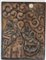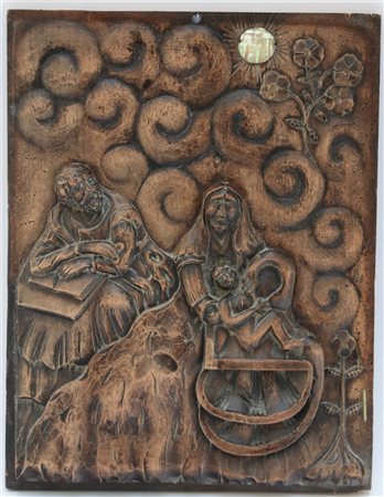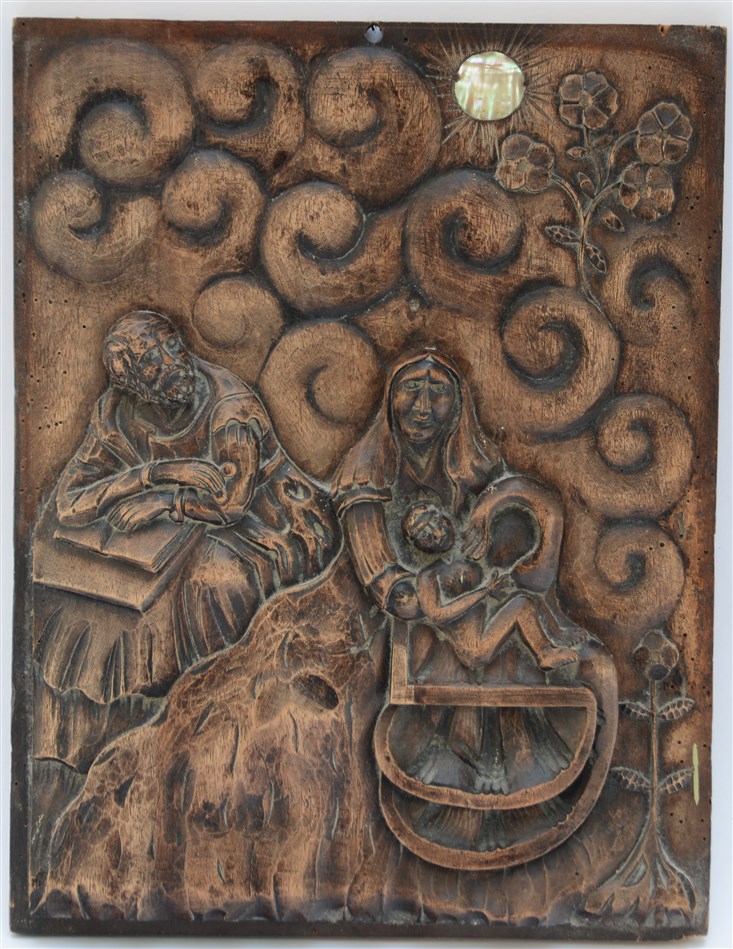 Arte popolare. Pannello scolpito con Sacra Famiglia in un paesaggio con sole st