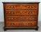 Antico cassettone in noce a quattro cassetti, intarsiato a filettature e profili di pennuti. Piano scantonato e guarnizioni in metallo (cm 150x115x57) (difetti)