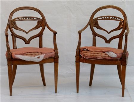 Coppia di poltrone con schienale a giorno traforato e intagliato, gambe anterio