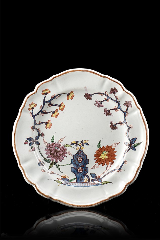 Manifattura di Felice Clerici, Milano 1760 circa. Piatto polilobato in maiolica con decorazione a tutta superficie con due crisantemi affrontati che escono da una grossa radice blu. Bordo profilato in rosso bruno. Il decoro è di derivazione da un motivo giapponese Kakiemon (d. cm 23,5) (puntinature allo smalto e sbavature di colore)