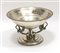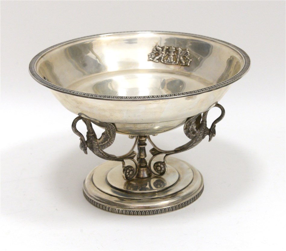 Alzata in argento con decori a motivi classici sorretta da tre cigni a tutto tondo poggianti su base circolare. Bordure decorate a palmette. Titolo 800 (g 1145 ca.) (difetti)
