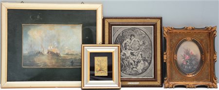 Lotto composto da due multipli su lamina riffiguranti "Barche" e "L'autonne", una stampa su tela e un dipinto raffigurante "Fiori". Misure diverse. In cornici